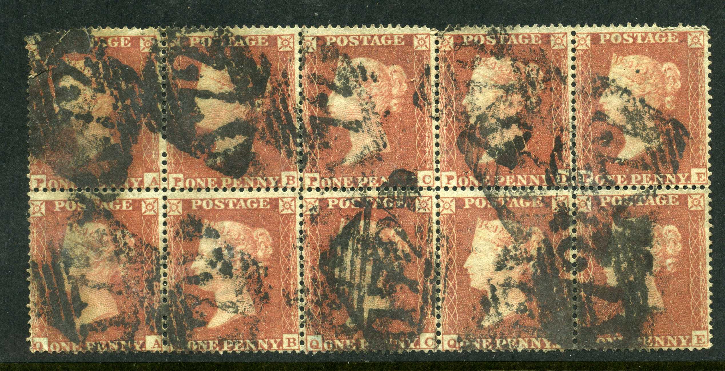 GB002Image | Penny Red block of 10 (1 damaged) with Irish numeral cancel 72, an attractive multiple.