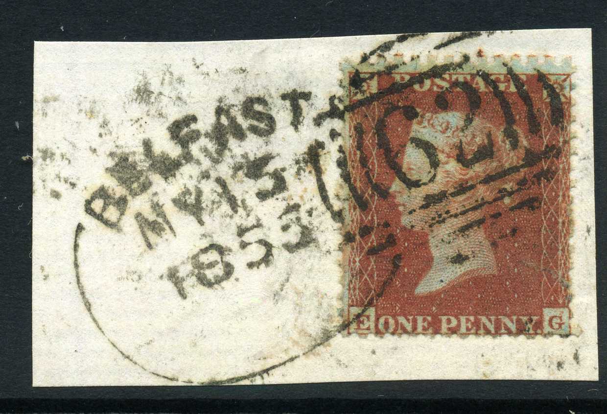 GB006Image | 1855 Penny Red used on piece with fine strike of Belfast Spoon cancel 15/5/55