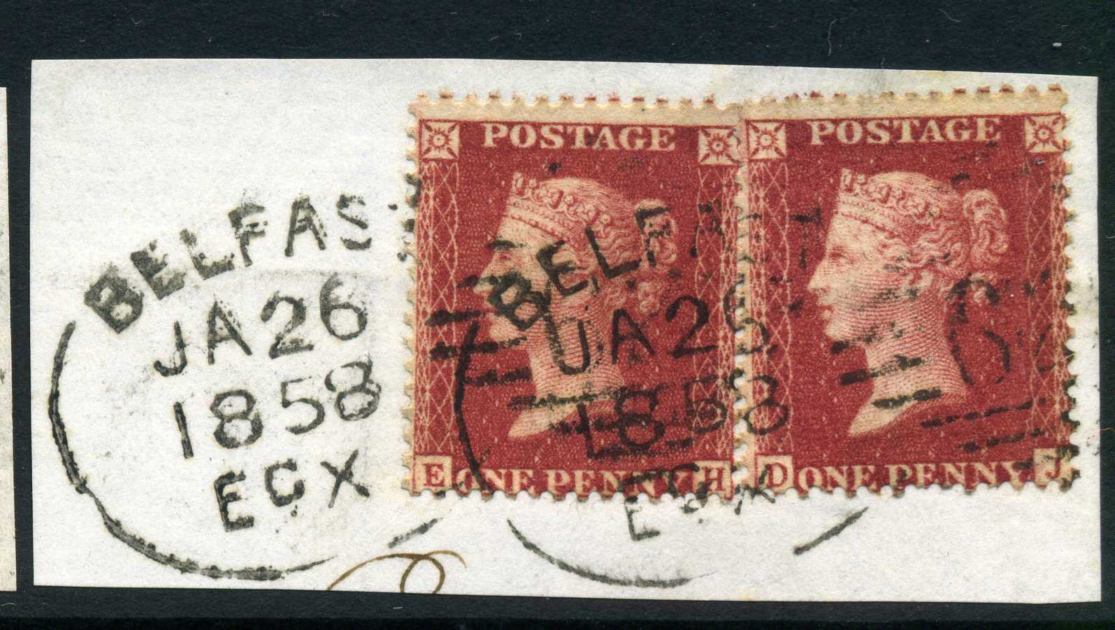 GB009 Image | 1858 Penny Red 2 examples used on piece with 2 fine strikes of Belfast Spoon cancel 26/1/58
