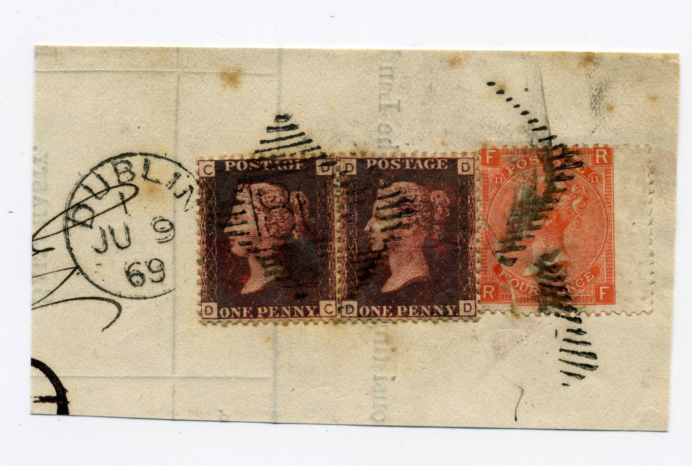 1869 Piece bearing pair Penny red and 4d orange (fault) all tied by Dublin Duplex |