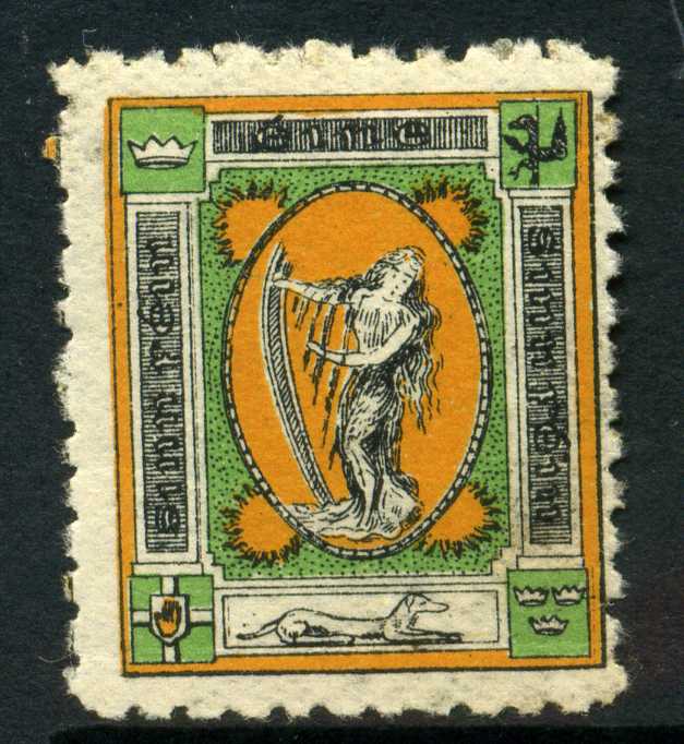 POL014Image | 1907-16 Sinn Fein Propoganda Label Female with Harp Narrow Crown top right corner example used with manuscript cancel and scarce. | 40 |