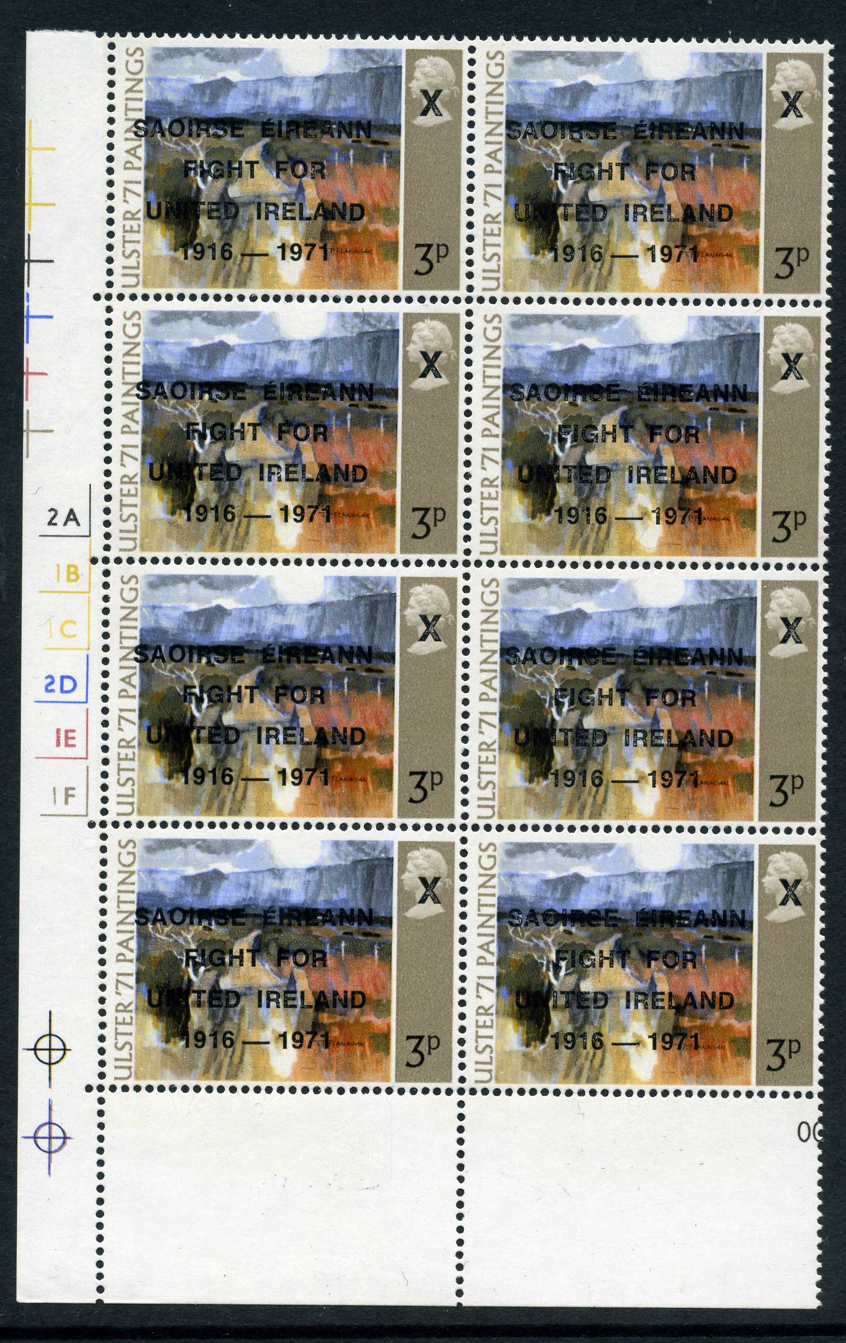 POL046 Image | 1971 Sinn Fein Saoirse overprint on 3p Ulster Paintings fine unmounted mint Cylinder Block of 8 and very scarce. | 60 |
