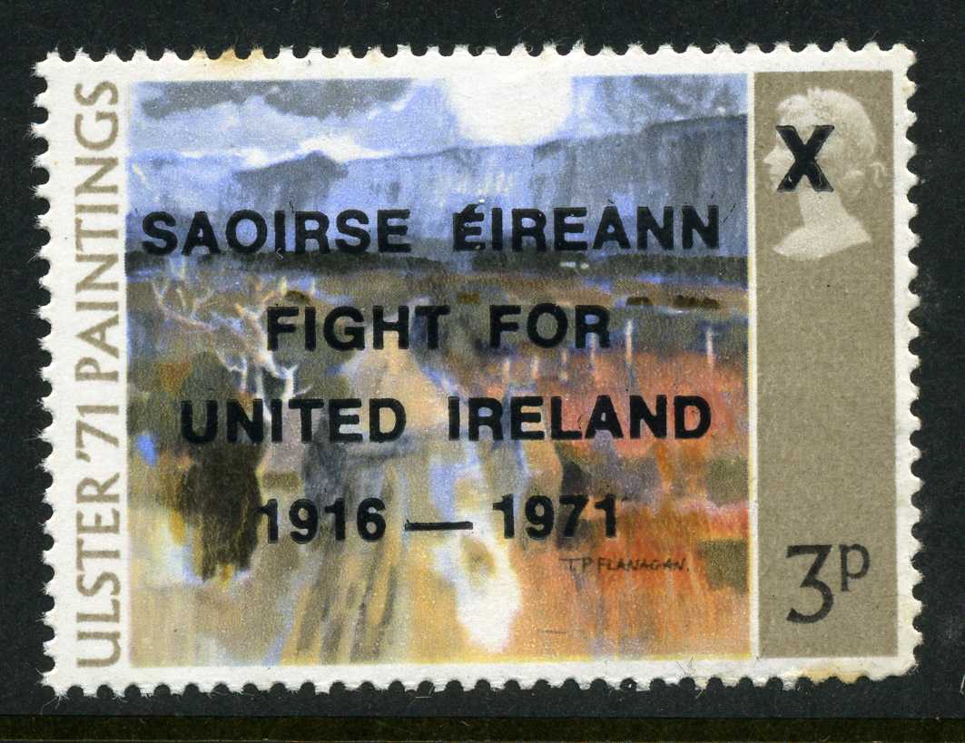 POL047 Image | Illegal Sinn Fein overprint "Saoirse Eireann Fight for United Ireland 1916-71" on Ulster Paintings 3p value unmounted mint and now becoming difficult to obtain. | 10 |