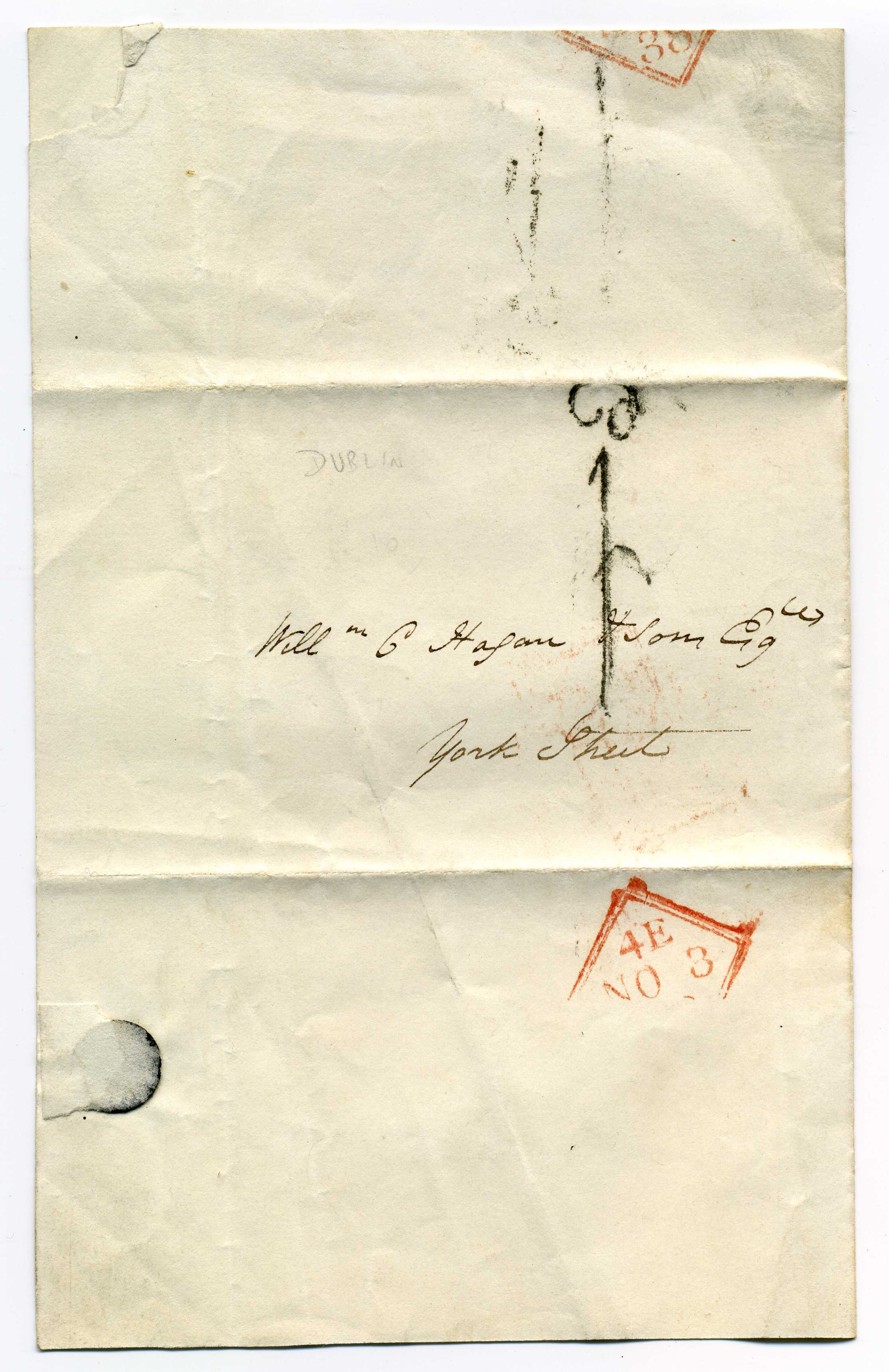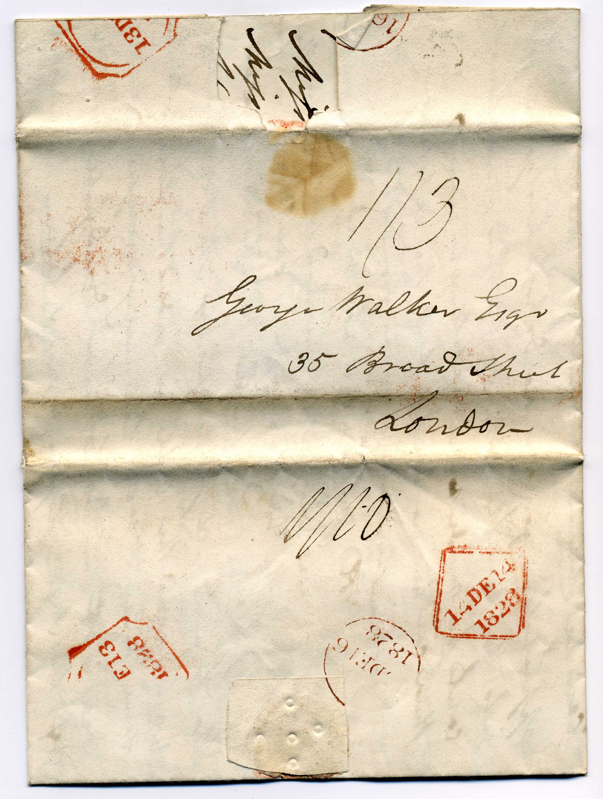 PH005 Image | 1828 Entire to London rated 1-3d with on reverse octagonal datestamp 13/12/1825 and Dublin diamond 16/12/28 all in red. |