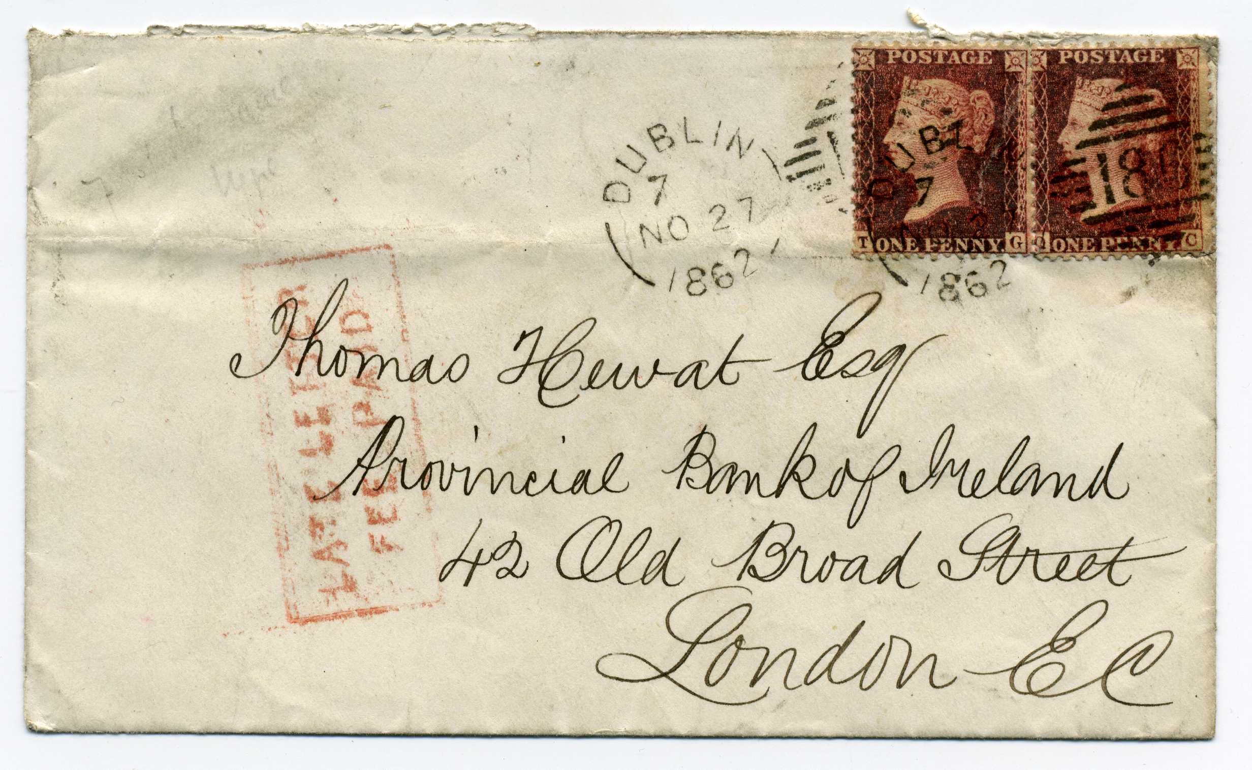 PH007.1Image | 1862 Cover bearing two Penny Reds tied Dublin Duplex and also with good strike of boxed "Late Letter Fee Paid"
