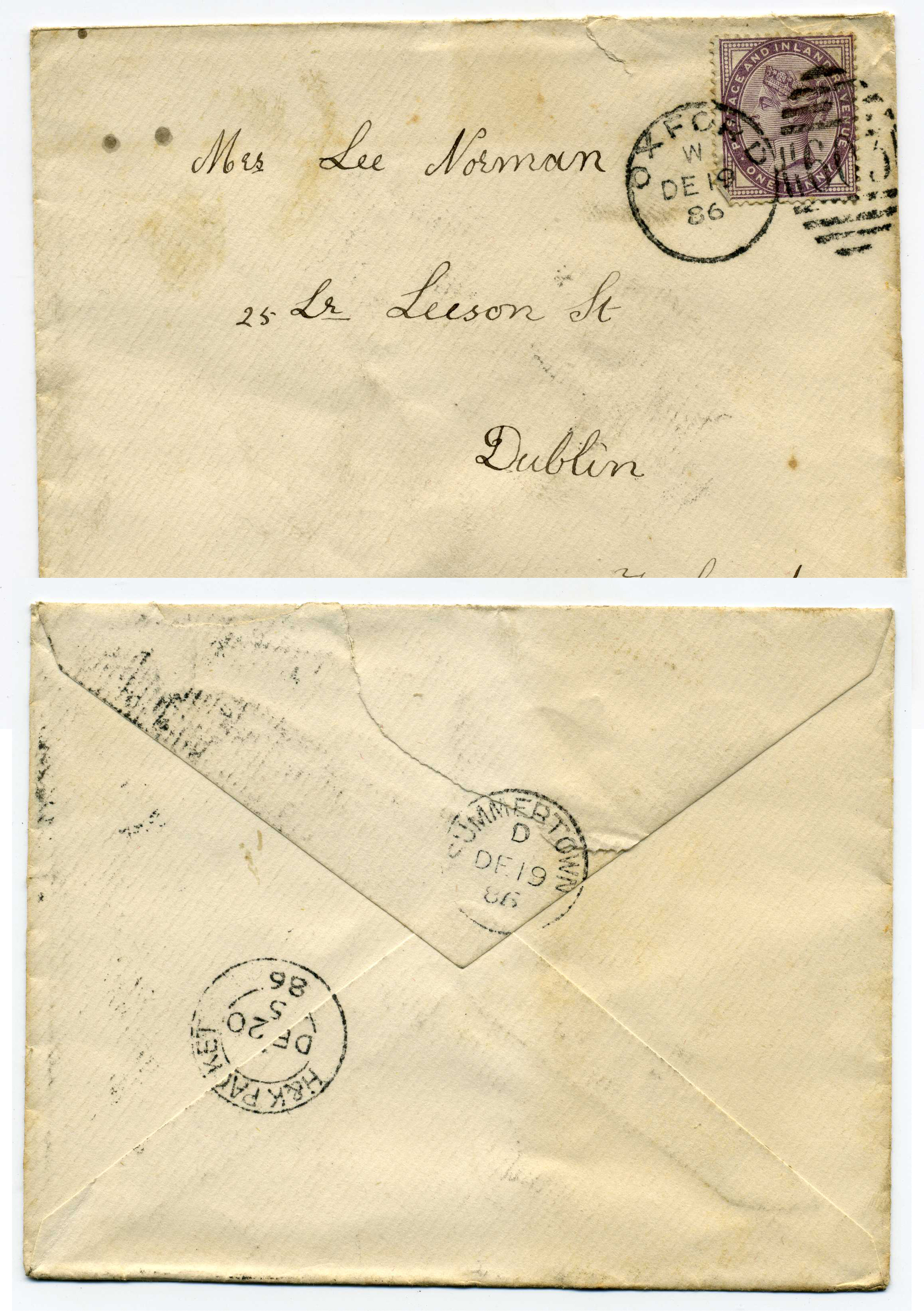PH007.5136 Image | 1886 Cover posted from Oxford to Dublin with excellent strike on reverse of Trollope type H & K double ring cancel.