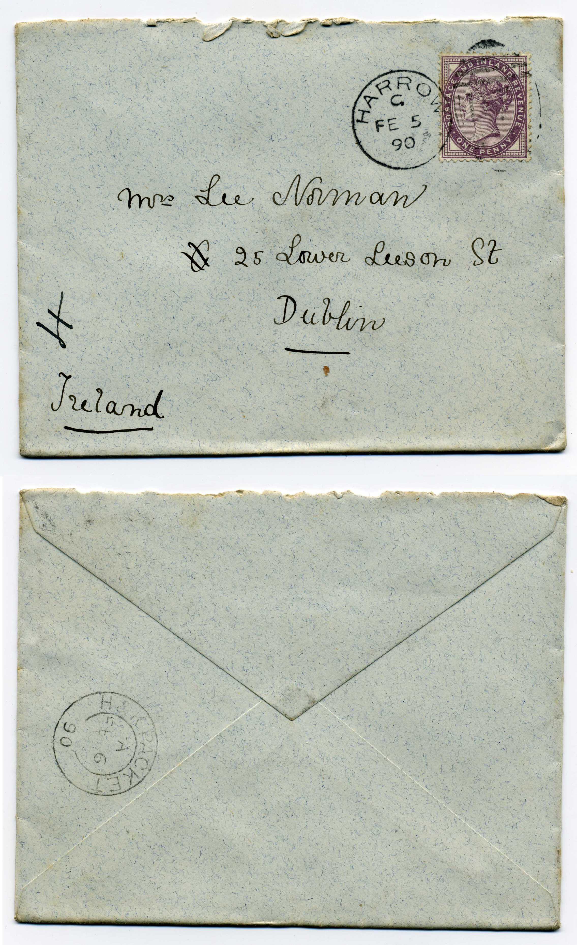 PH007.5159 Image | 1890 Cover posted from Harrow to Dublin with excellent strike on reverse of Trollope type H & K double ring cancel.