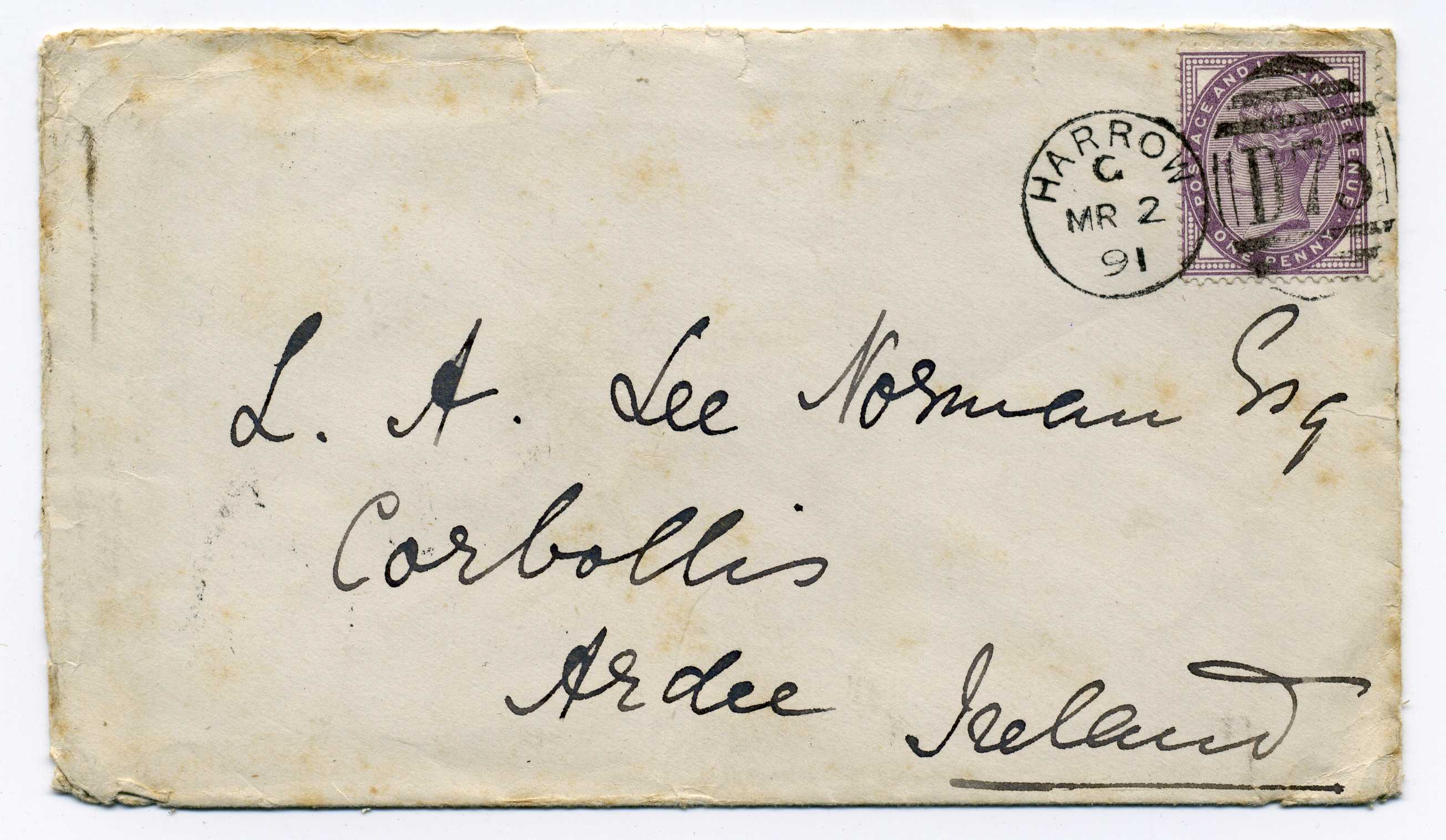 PH007.51596 Image | 1891 Cover from Harrow to Ardee with very good strike on reverse of Ardee Duplex