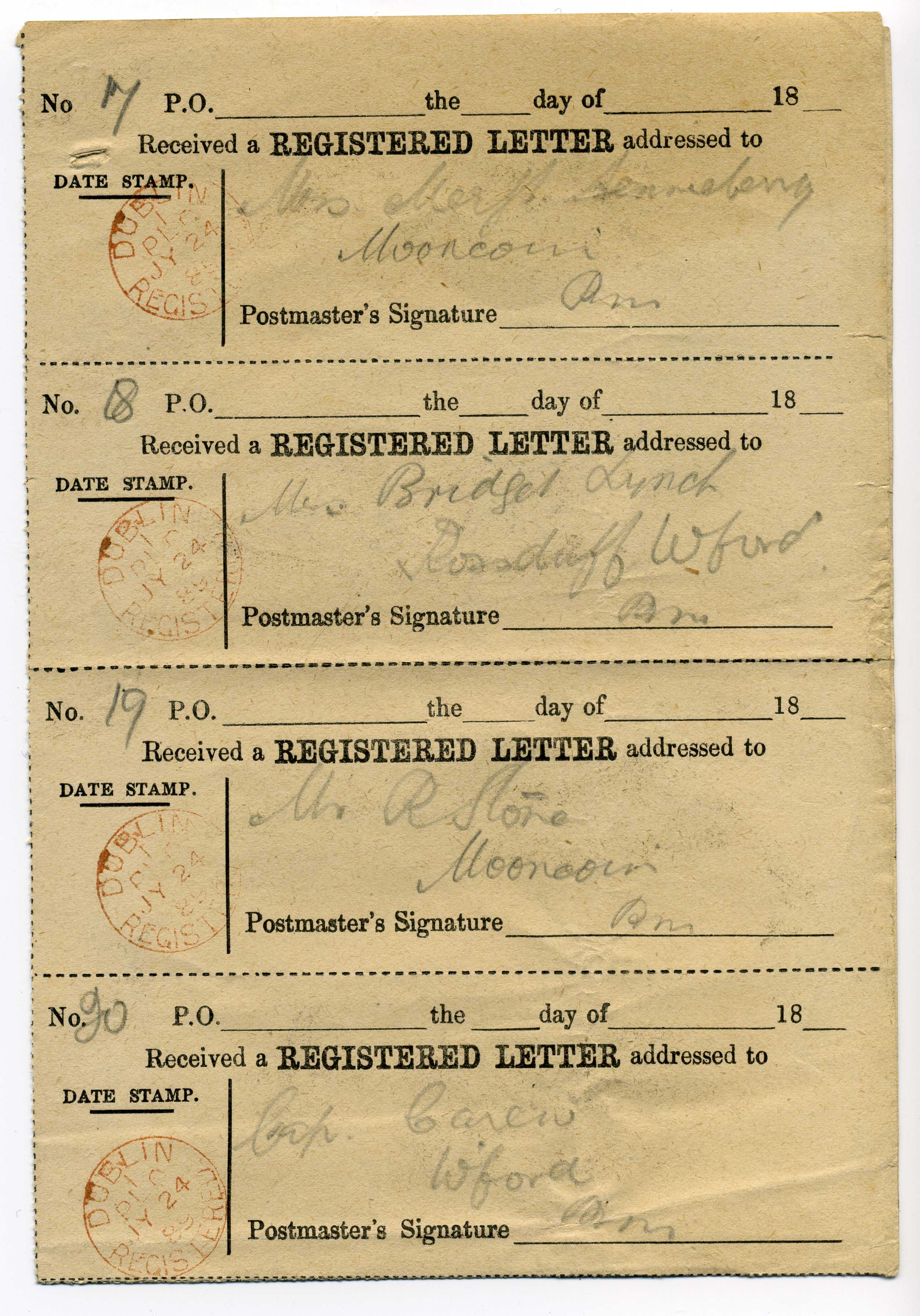 PH008.4 Image | 1889 July 24th Complete strip of 8 registered receipts no. 17 to 24, a most attractive multiple.