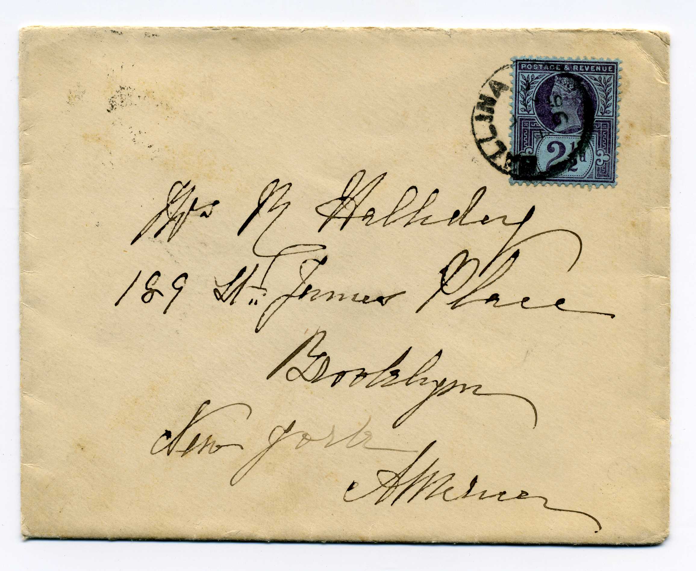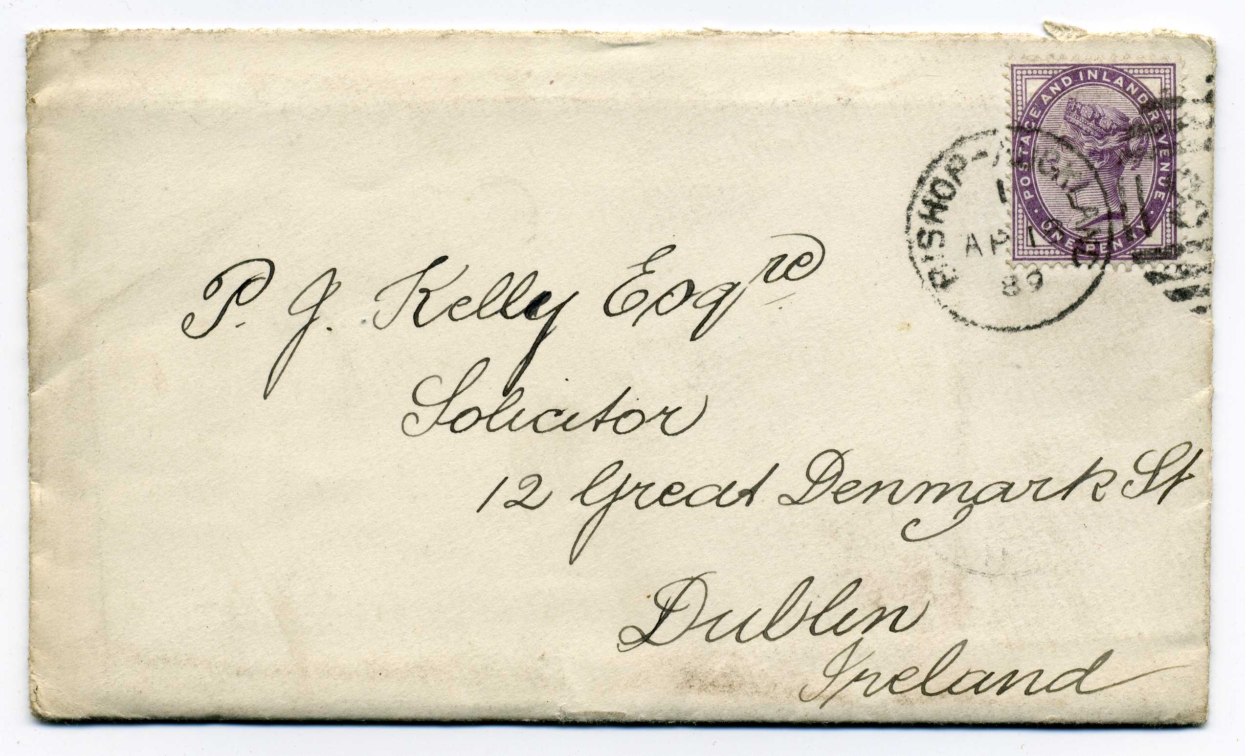 PH008.42 Image | 1889 Cover from England to Dublin with good strike on reverse of Trollope type H & K Packet Code A