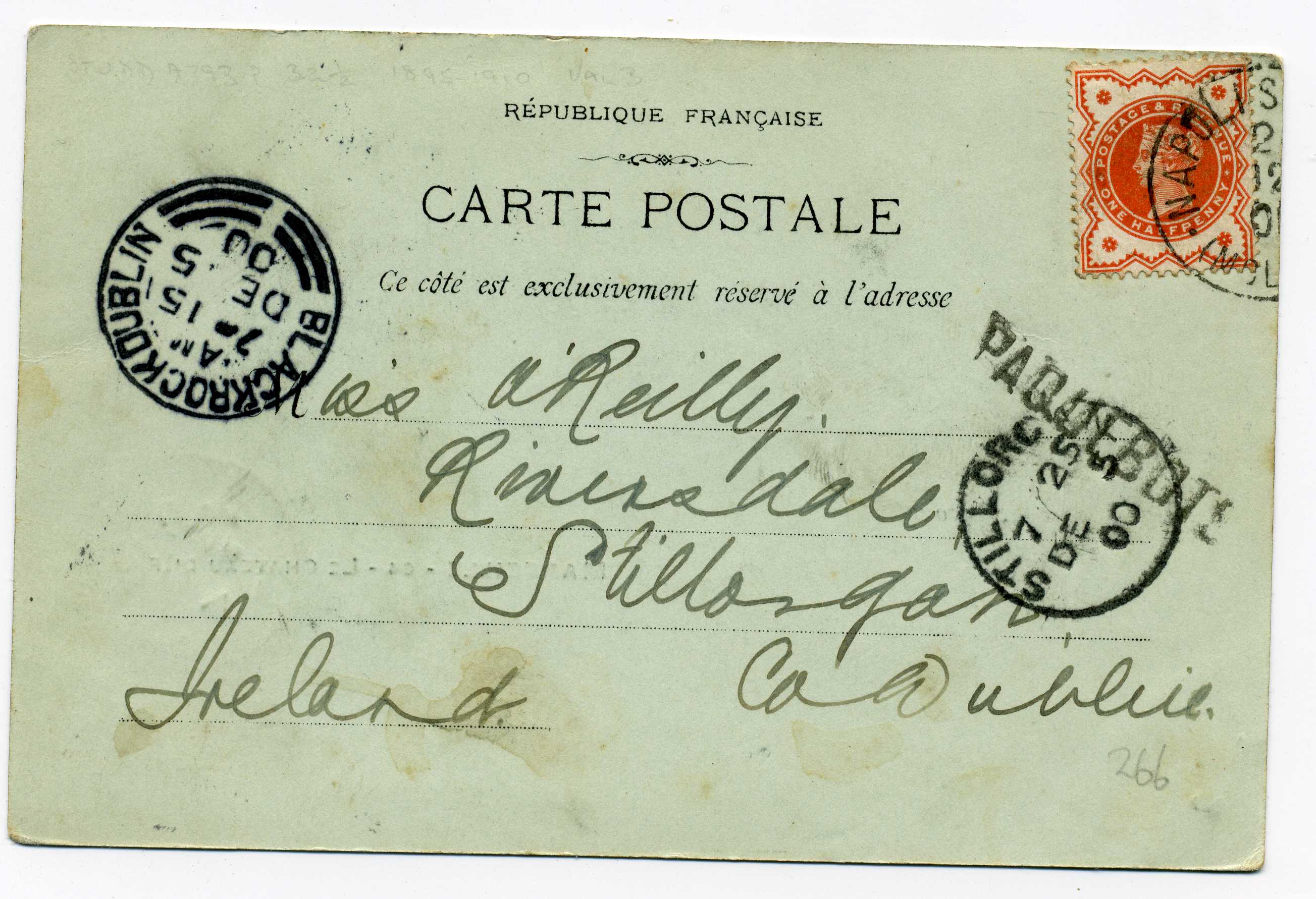 PH008.45 Image | 1900 Postcard addressed to Stillorgan with GB ½d Vermilion tied by Naples cds with straight line Paquebot together with Blackrock & Stillorgan arrival marks