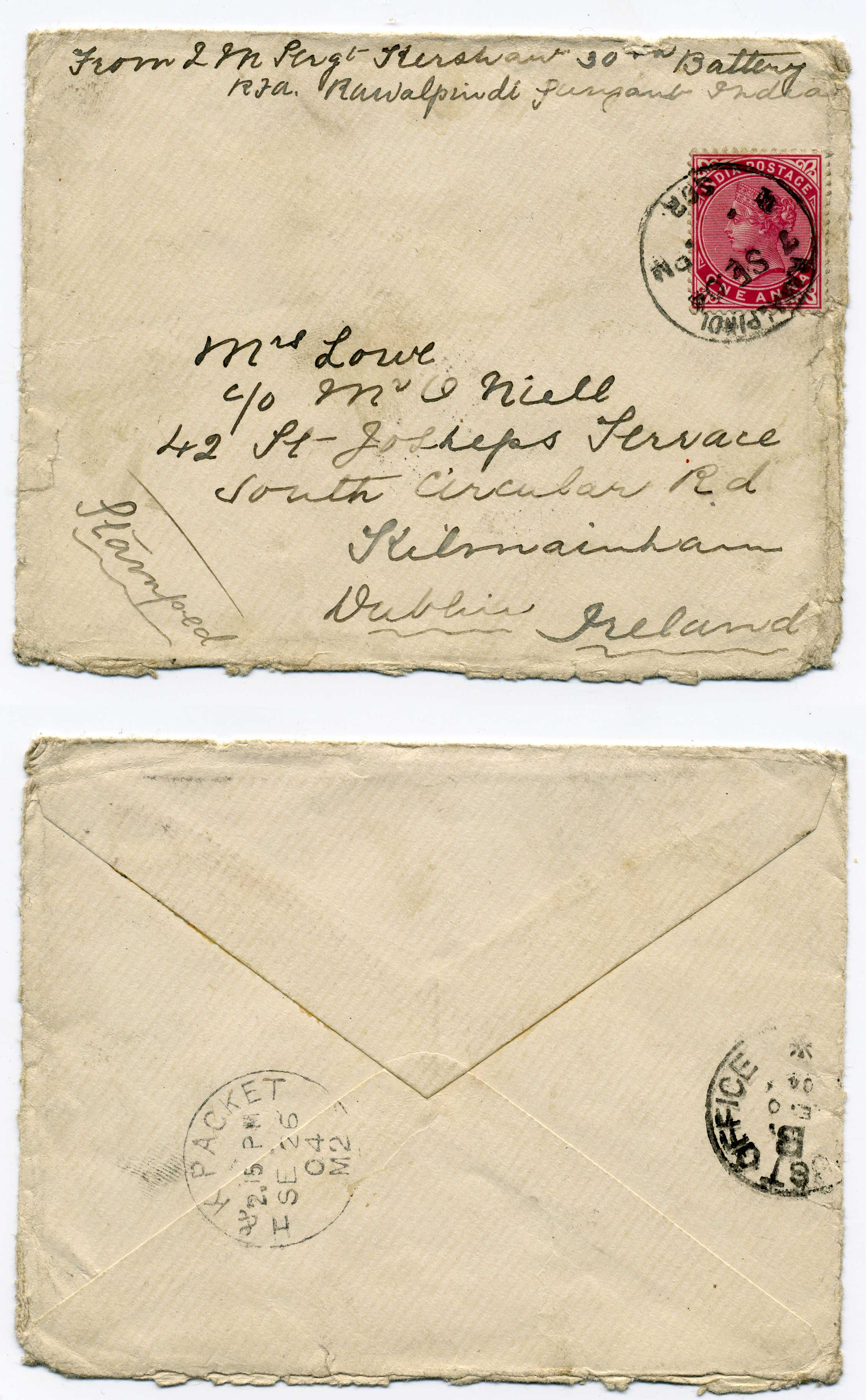 PH009 Image | 1904 cover from India to Dublin with on reverse excellent strike of "H & K Packet M2" datestamp.