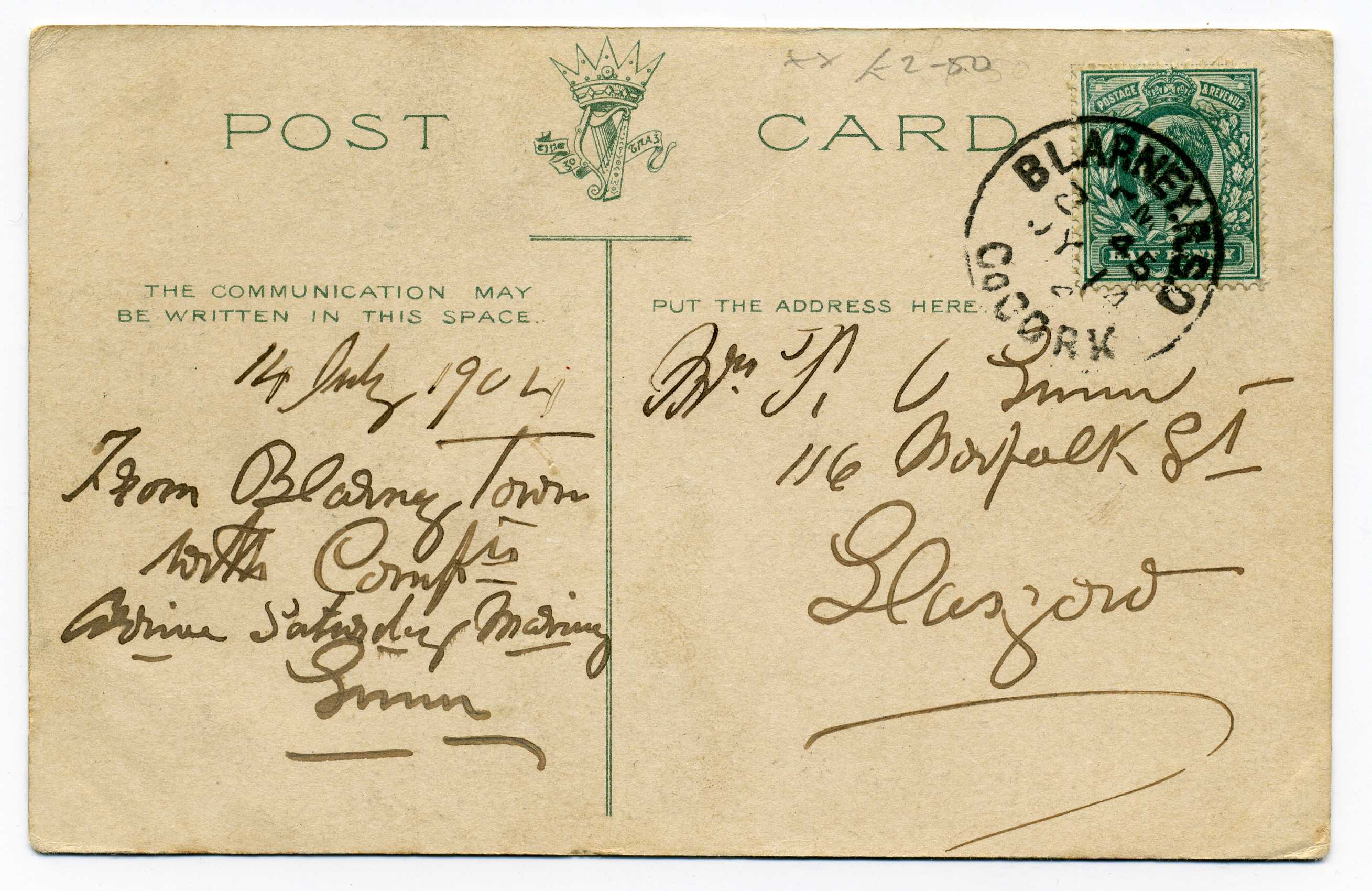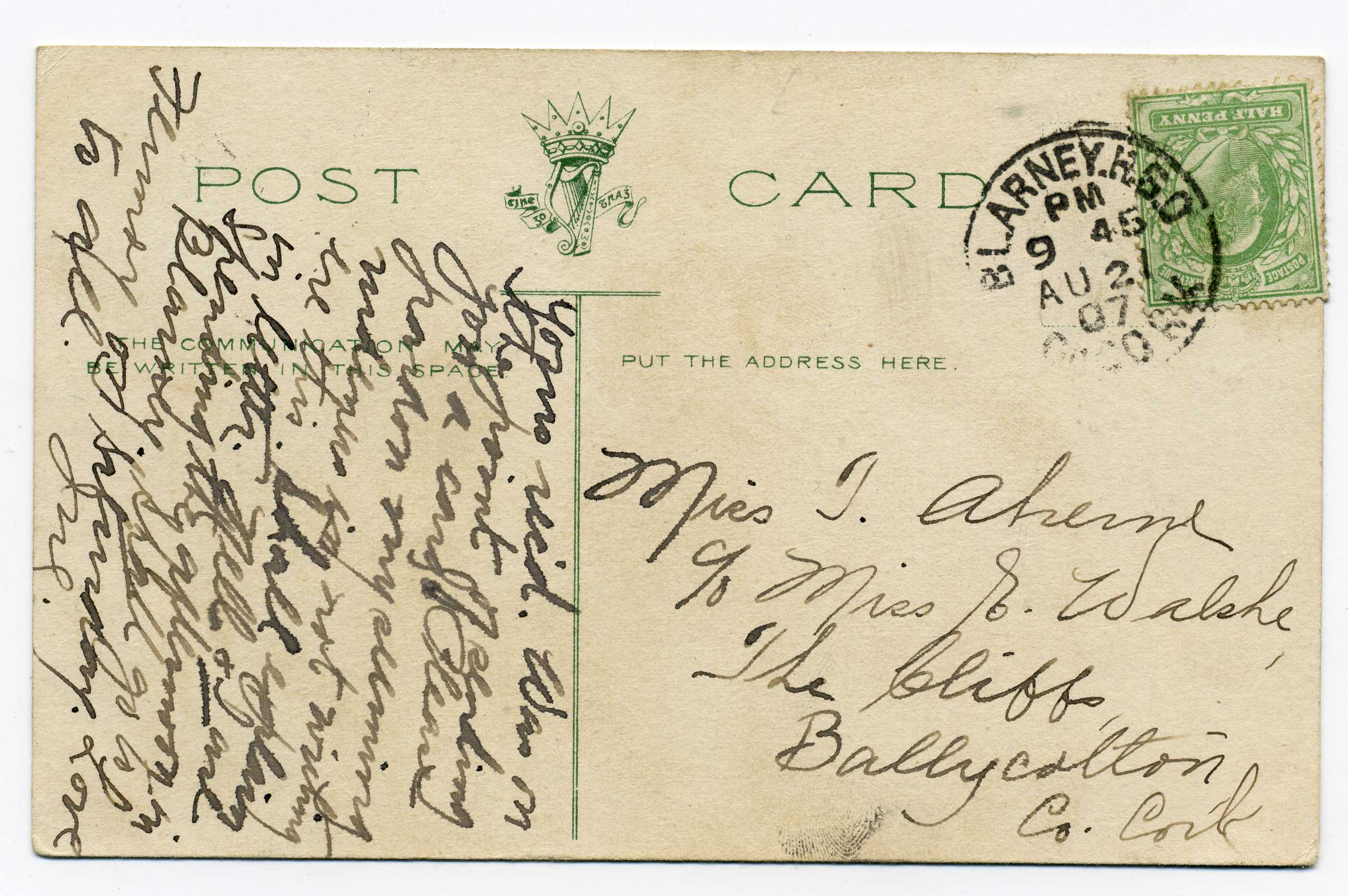PH014.5 Image | 1907 Picture Postcard used with ½d adhesive tied BlarneyR.S.O. cancel