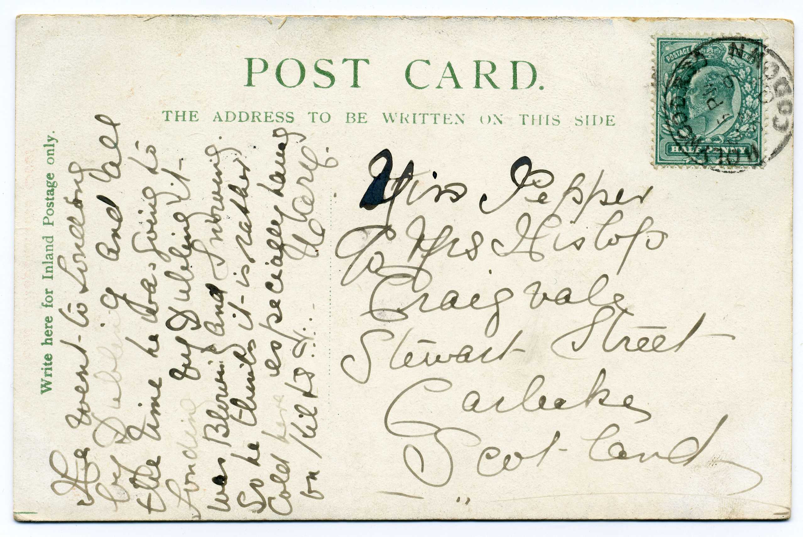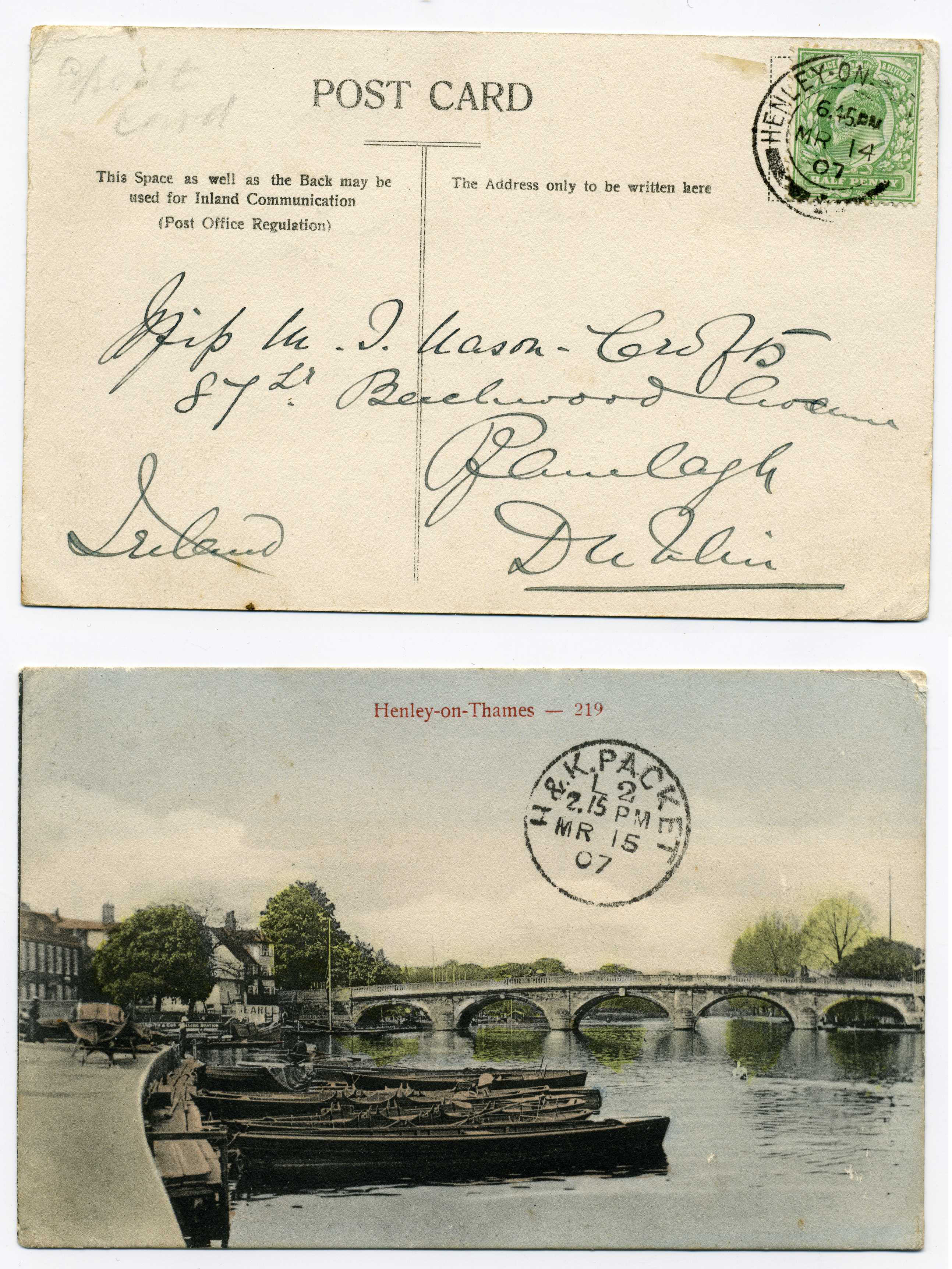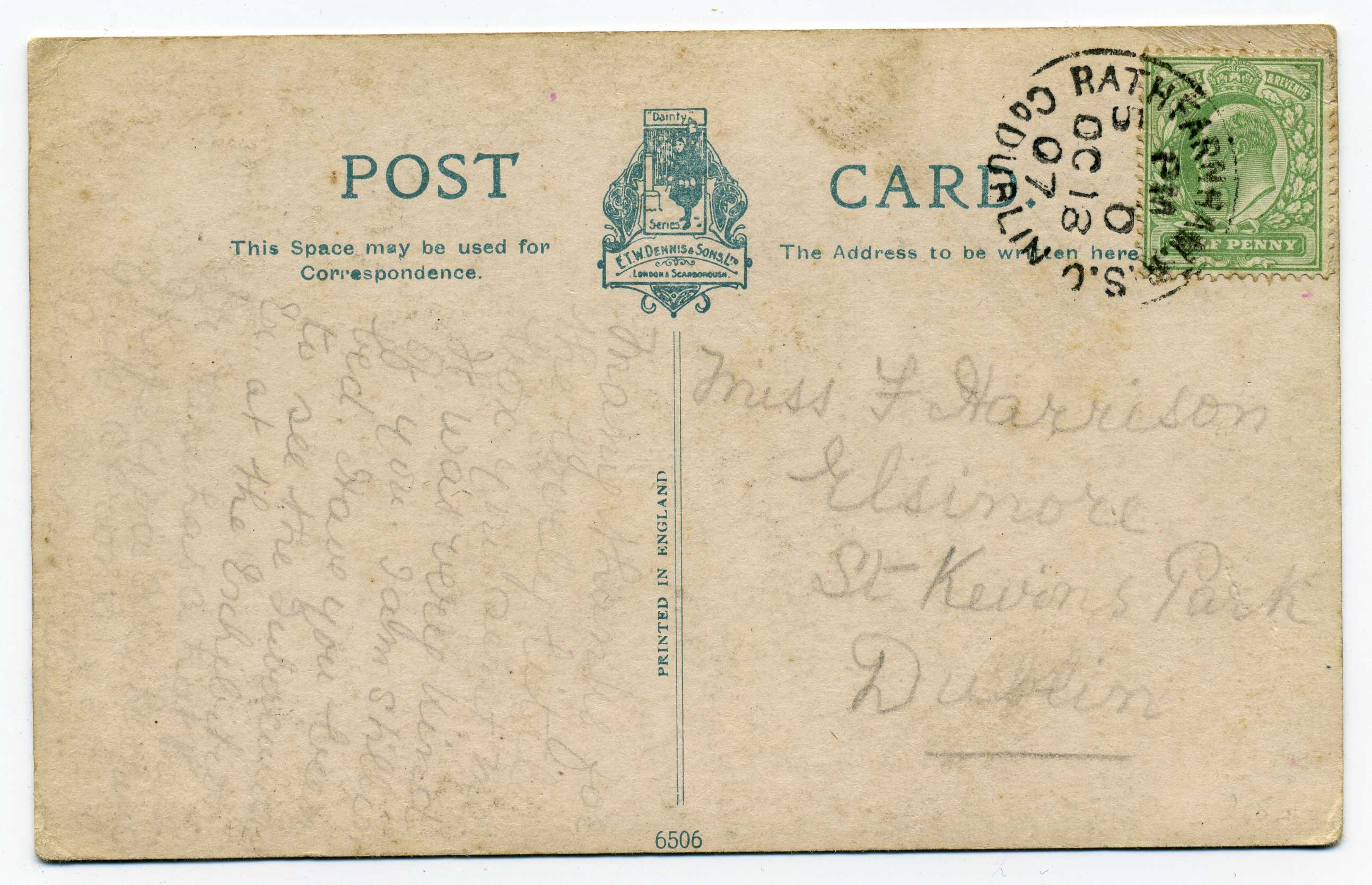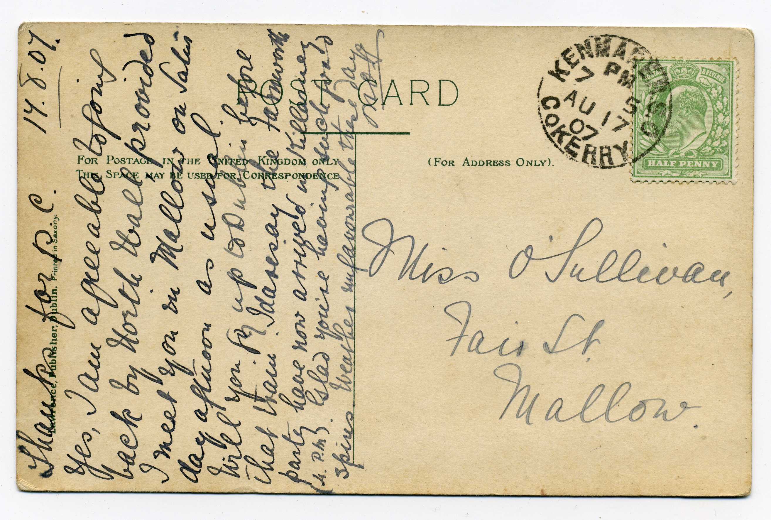 PH014 Image | 1907 Picture Postcard from England to Dublin with excellent strike of H & K Packet L2 datestamp on pictyure side, unusual.