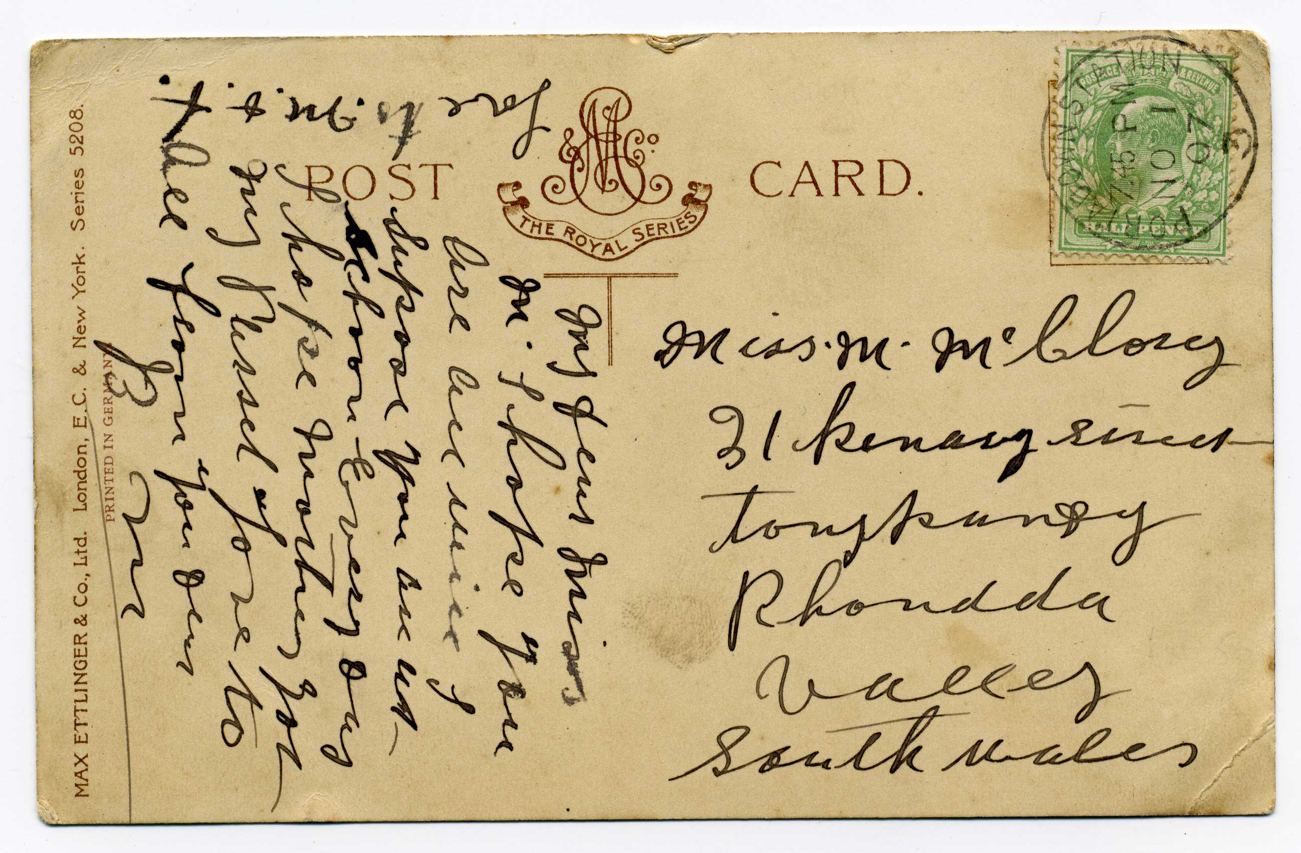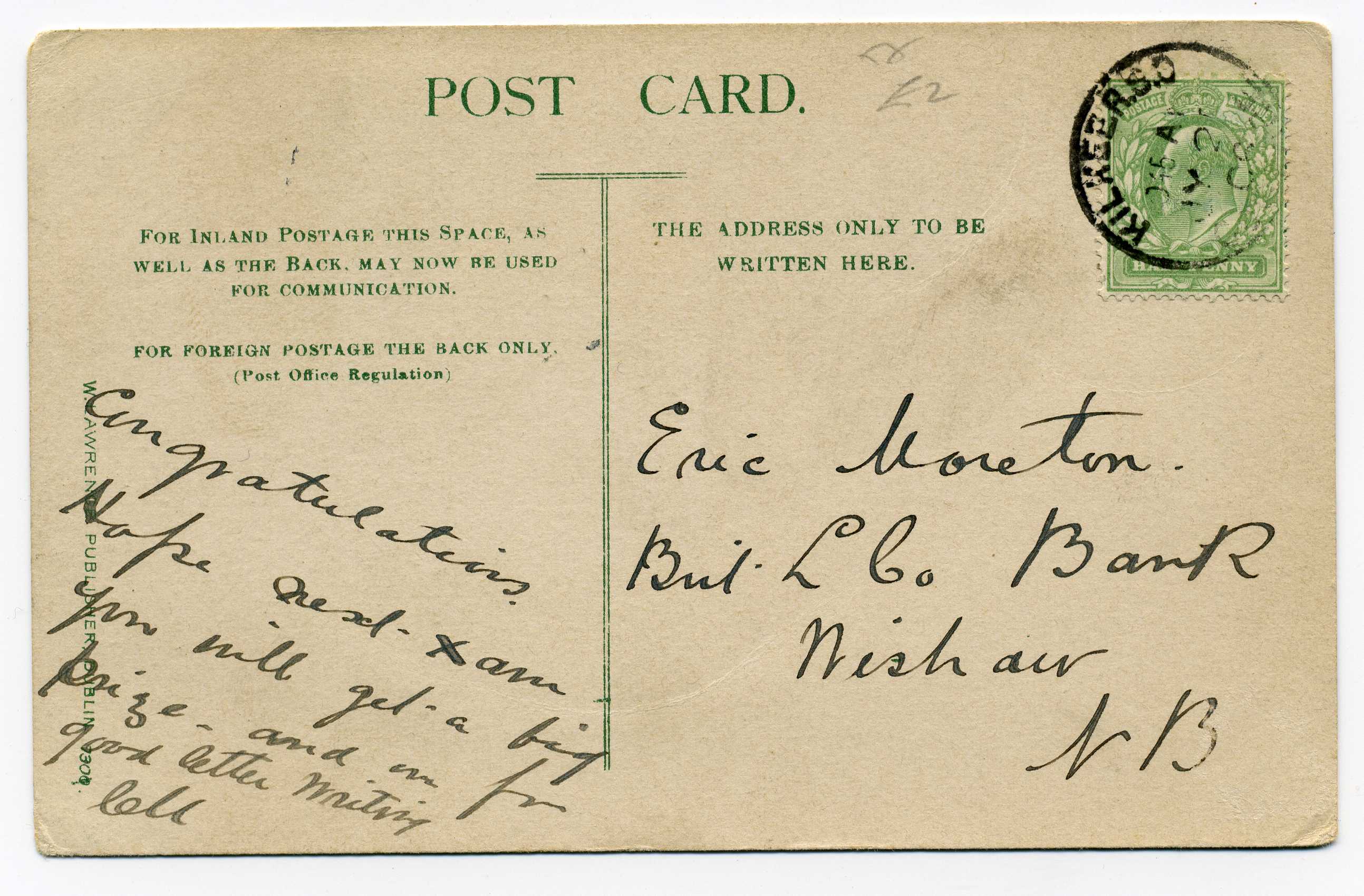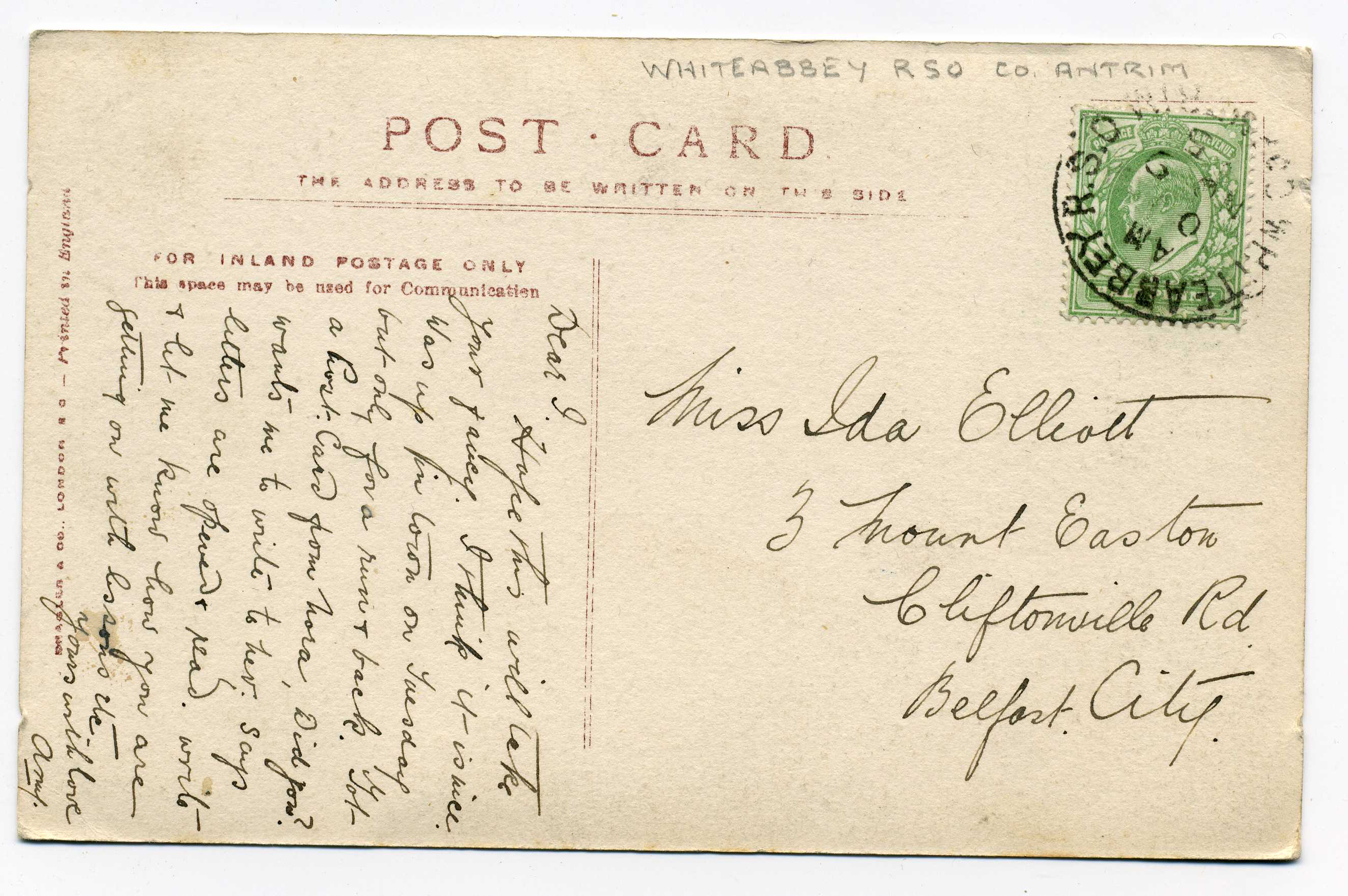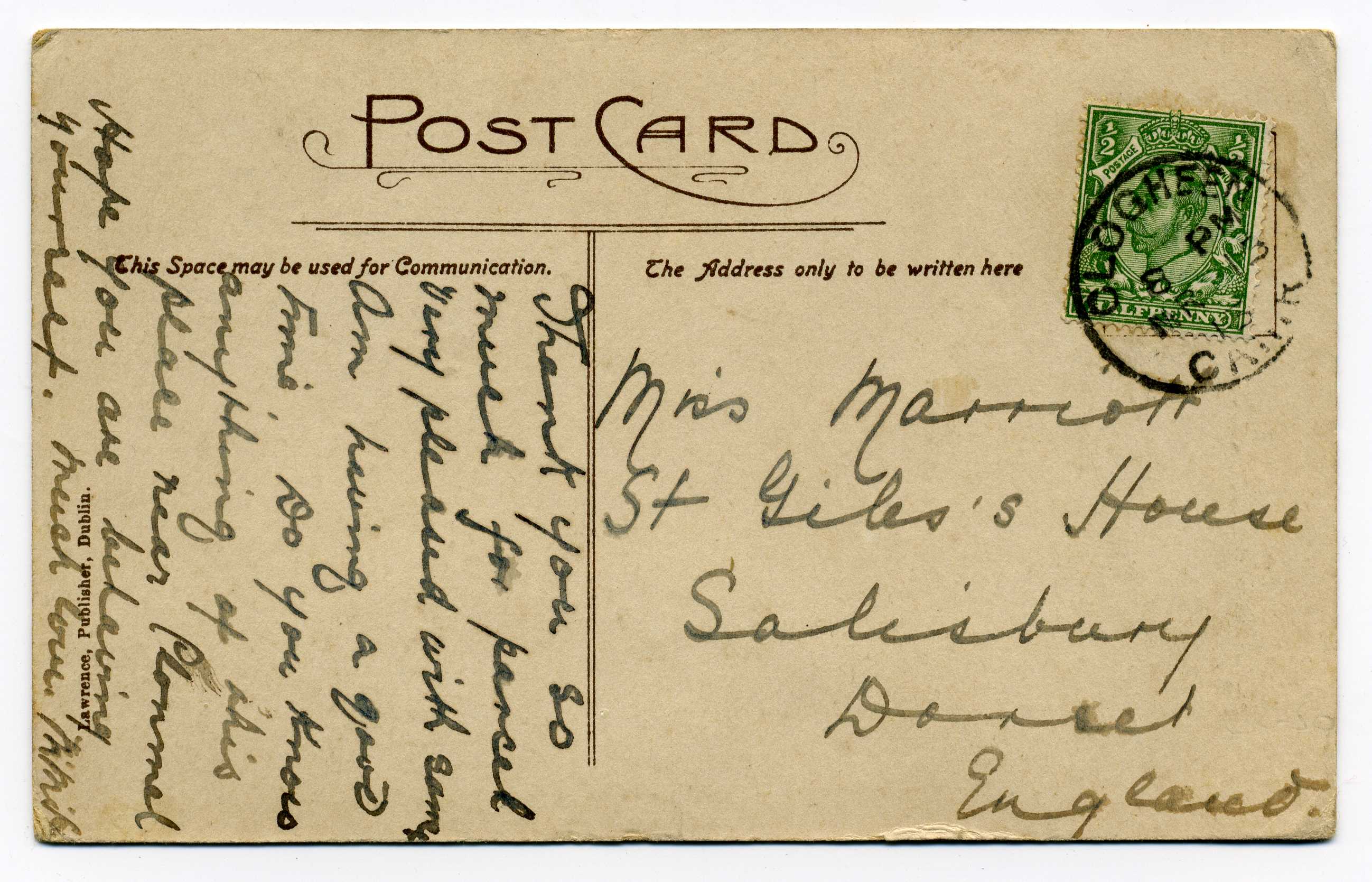 PH014 Image | 1907 Picture Postcard from England to Dublin with excellent strike of H & K Packet L2 datestamp on pictyure side, unusual.