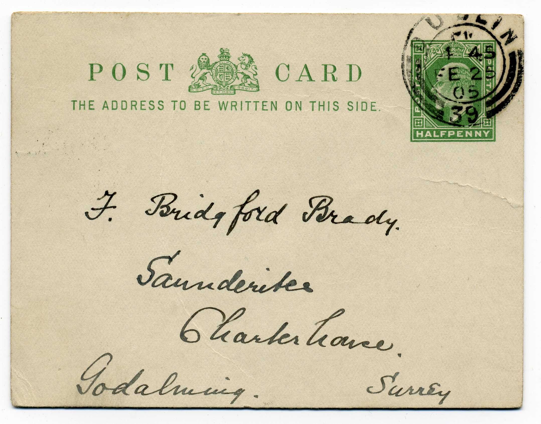 PH044.65 Image | 1923 Humerous postcard used to London with Wide Date 1½d tied by Bray cds, a difficult value to obtain used
