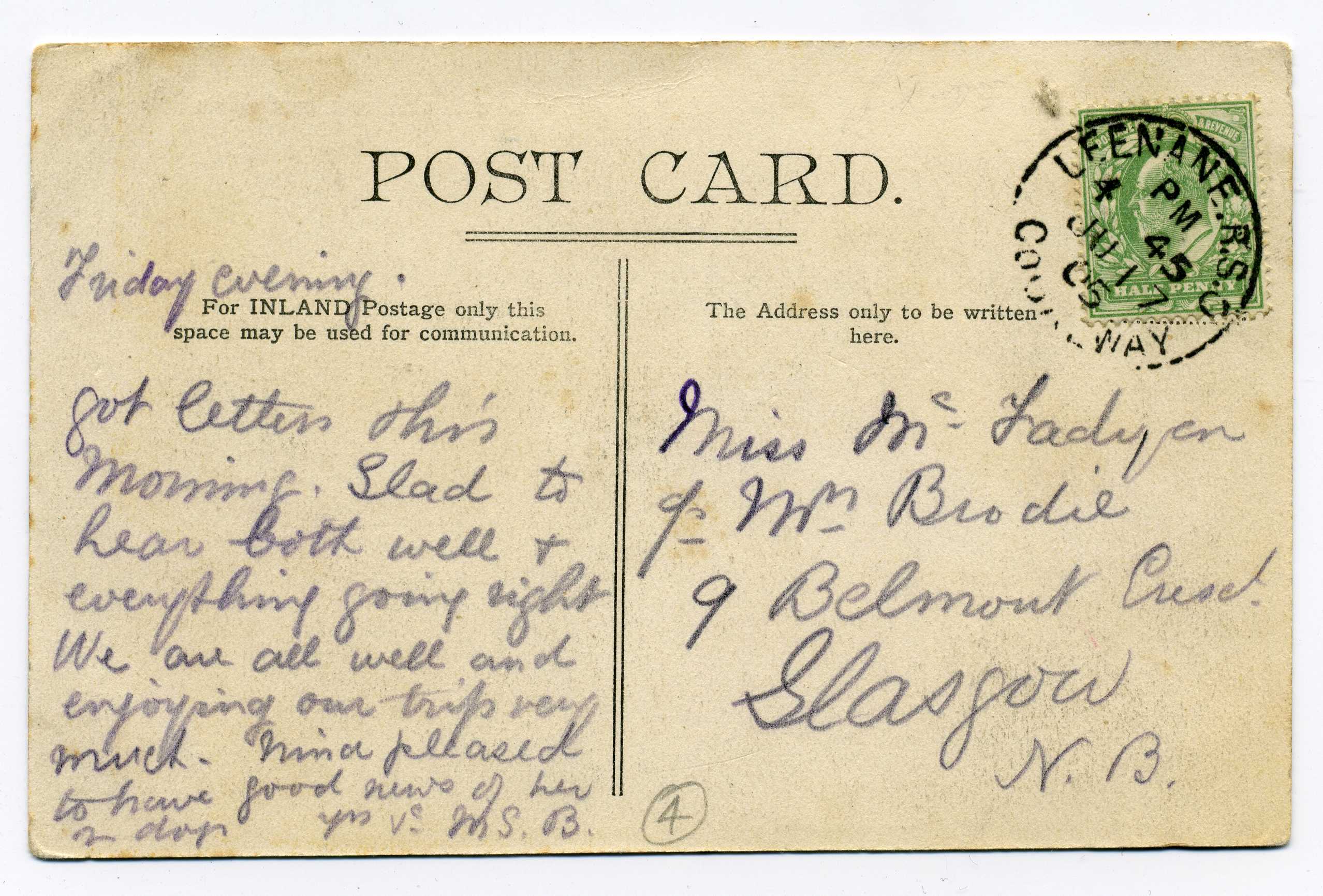 PH013.1 Image | 1907 Postcard with ½d adhesive used to Scotland with good strike of Holywood RSO.
