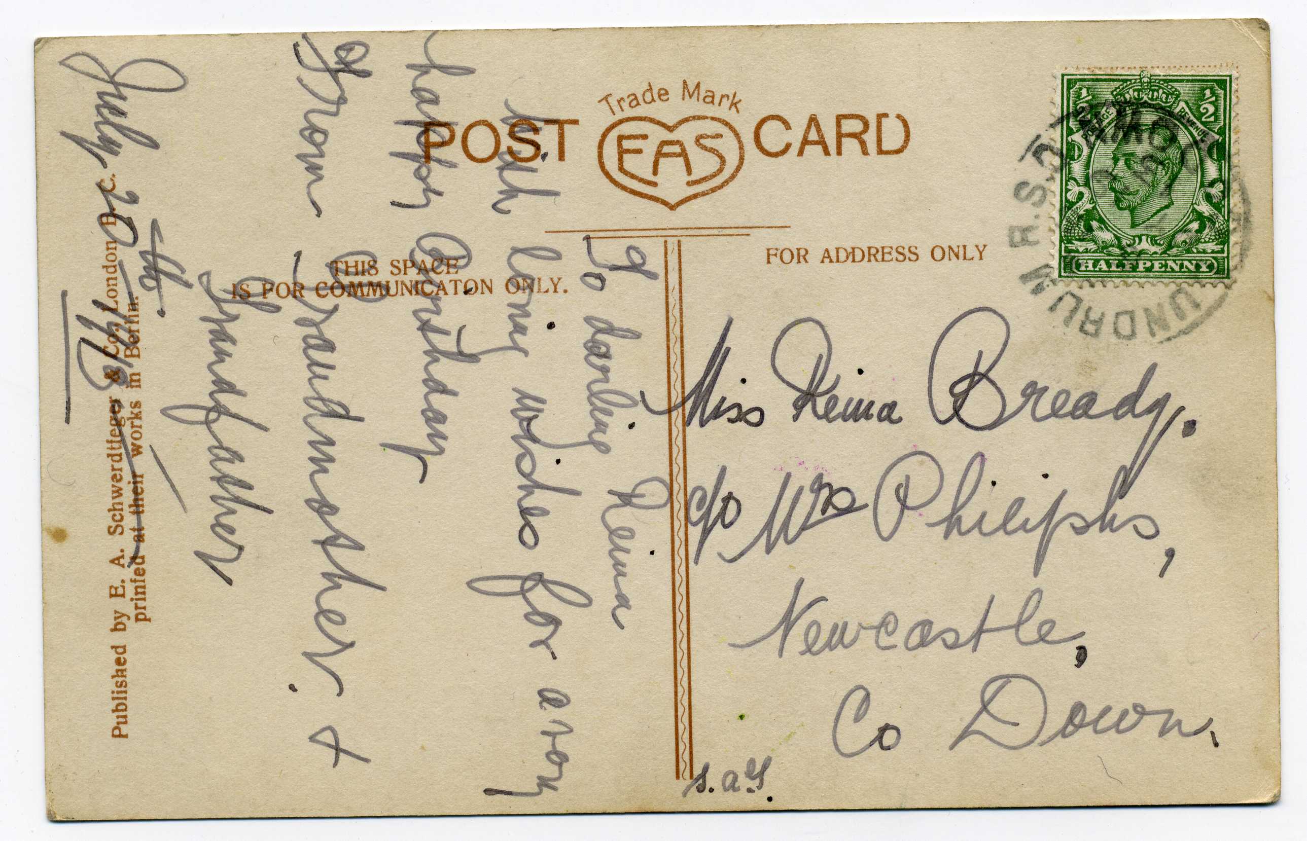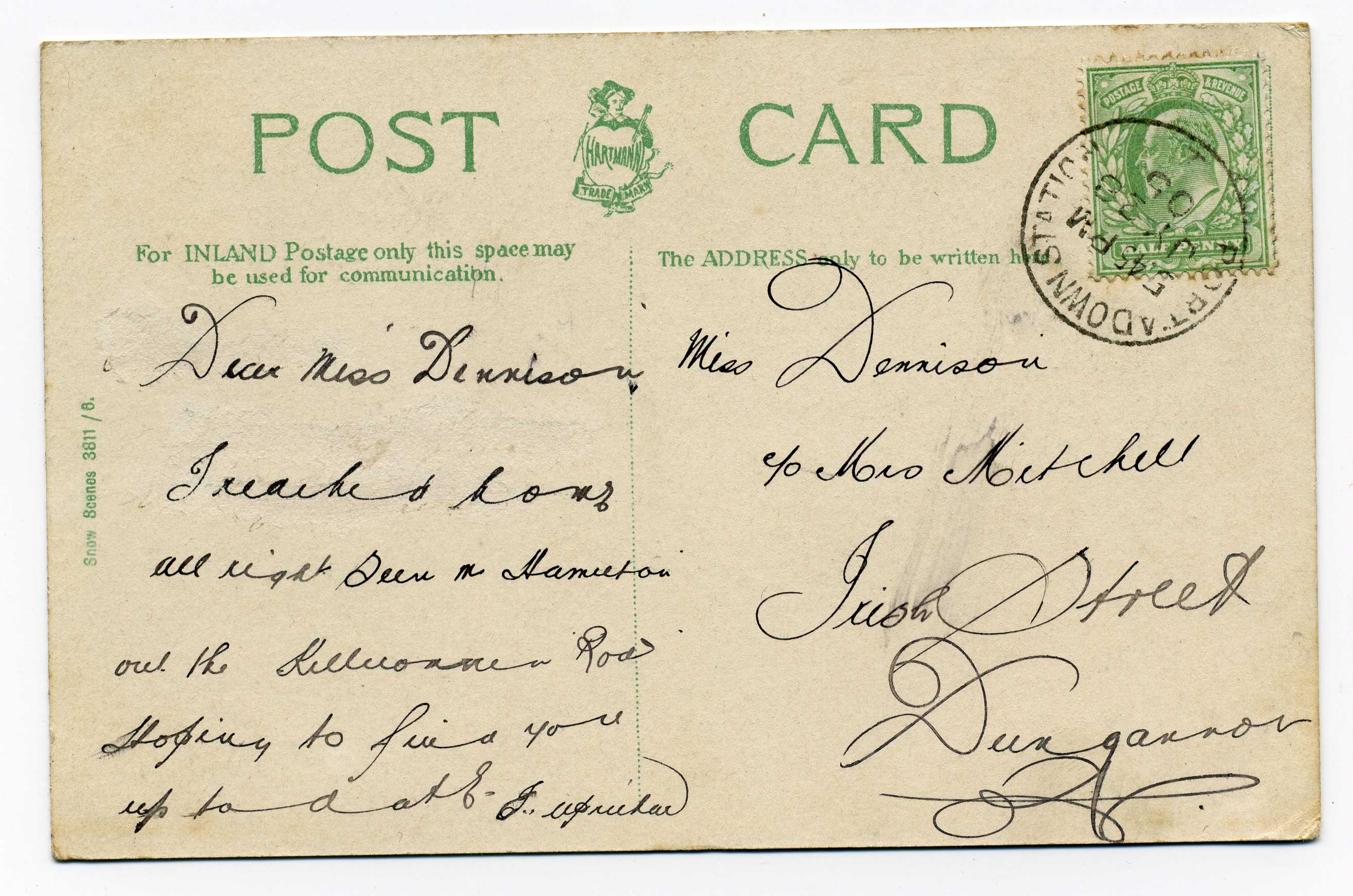 PH016 Image | 1913 Postcard bearing ½d adhesive tied by excellent strike "Dundrum RSO Co. Down".