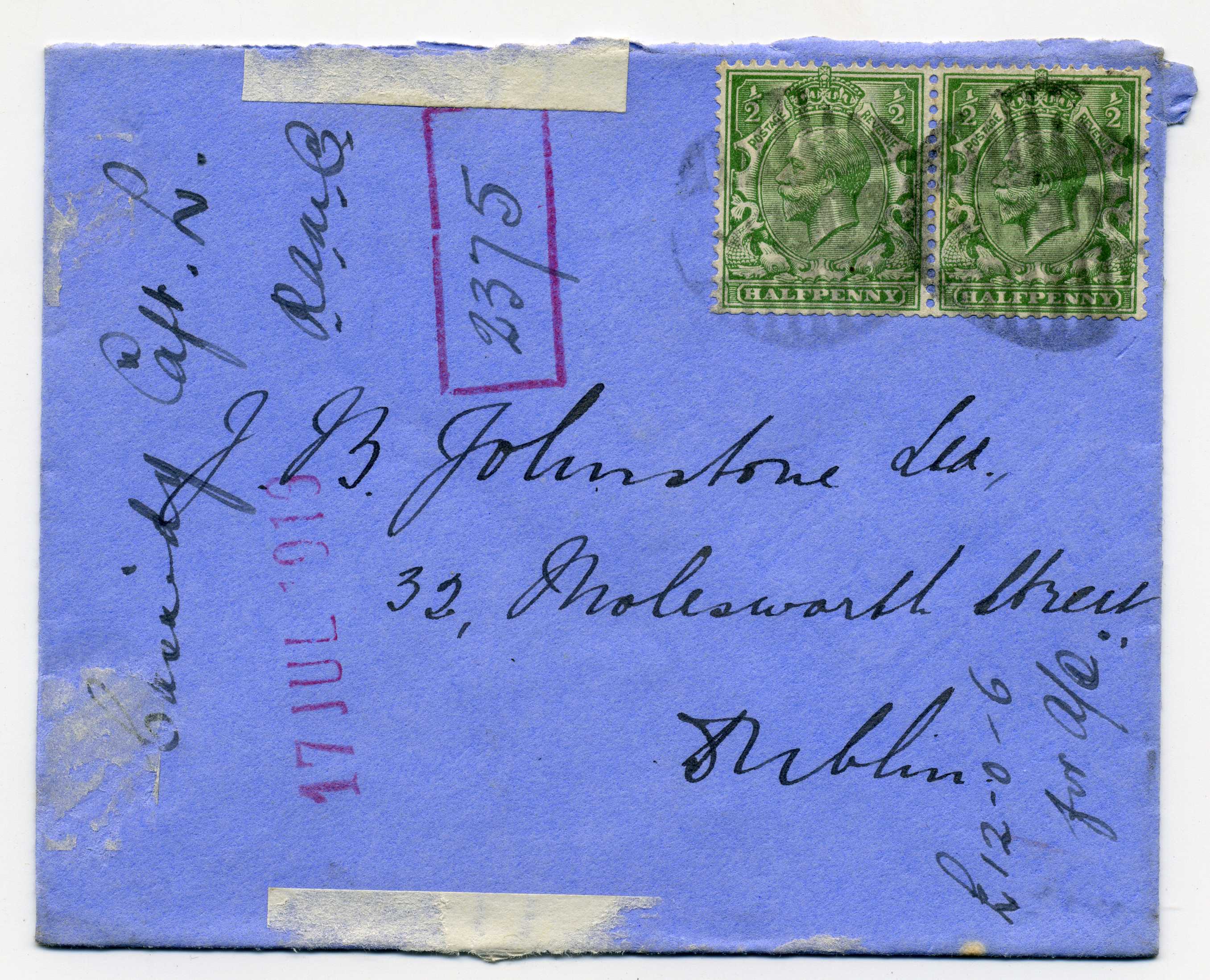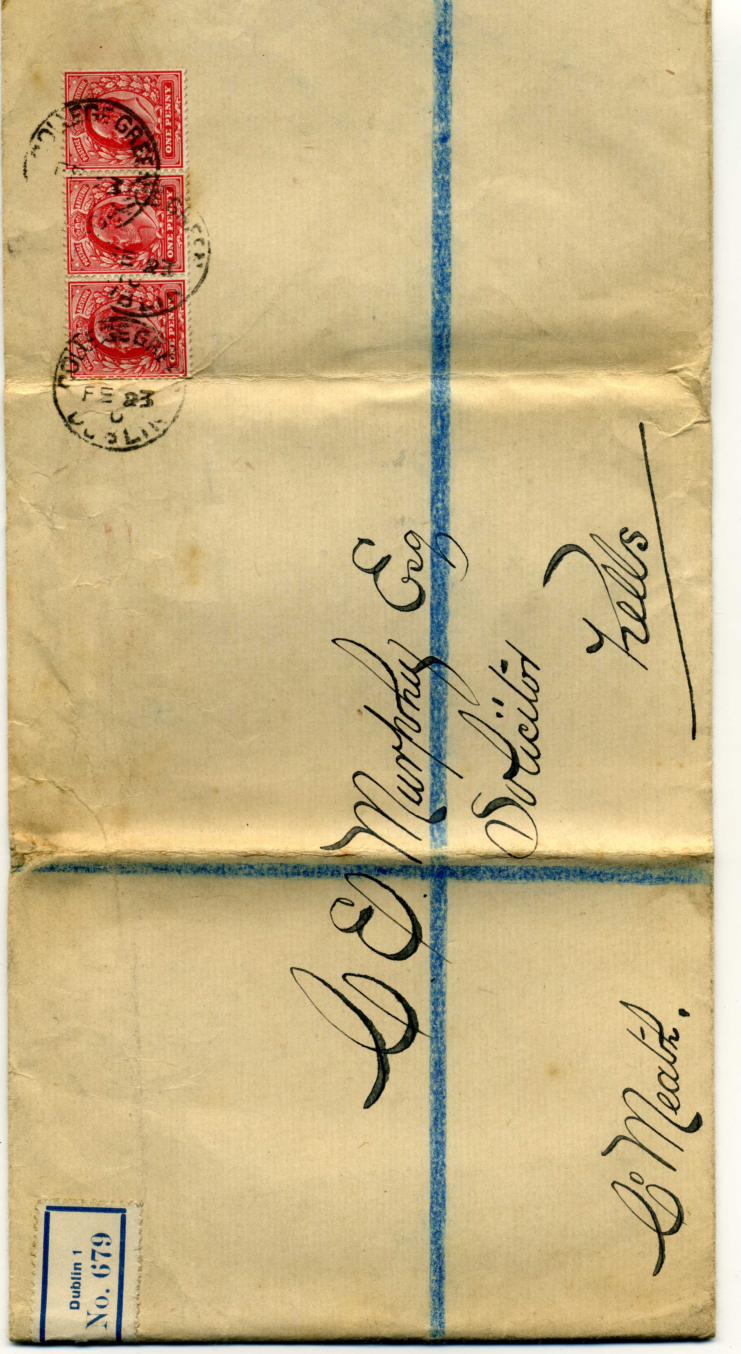 PH014.7 Image | 1910 Large sized registered envelope (folded in three) with horizontal strip of three one penny definitives tied by Dublin cds