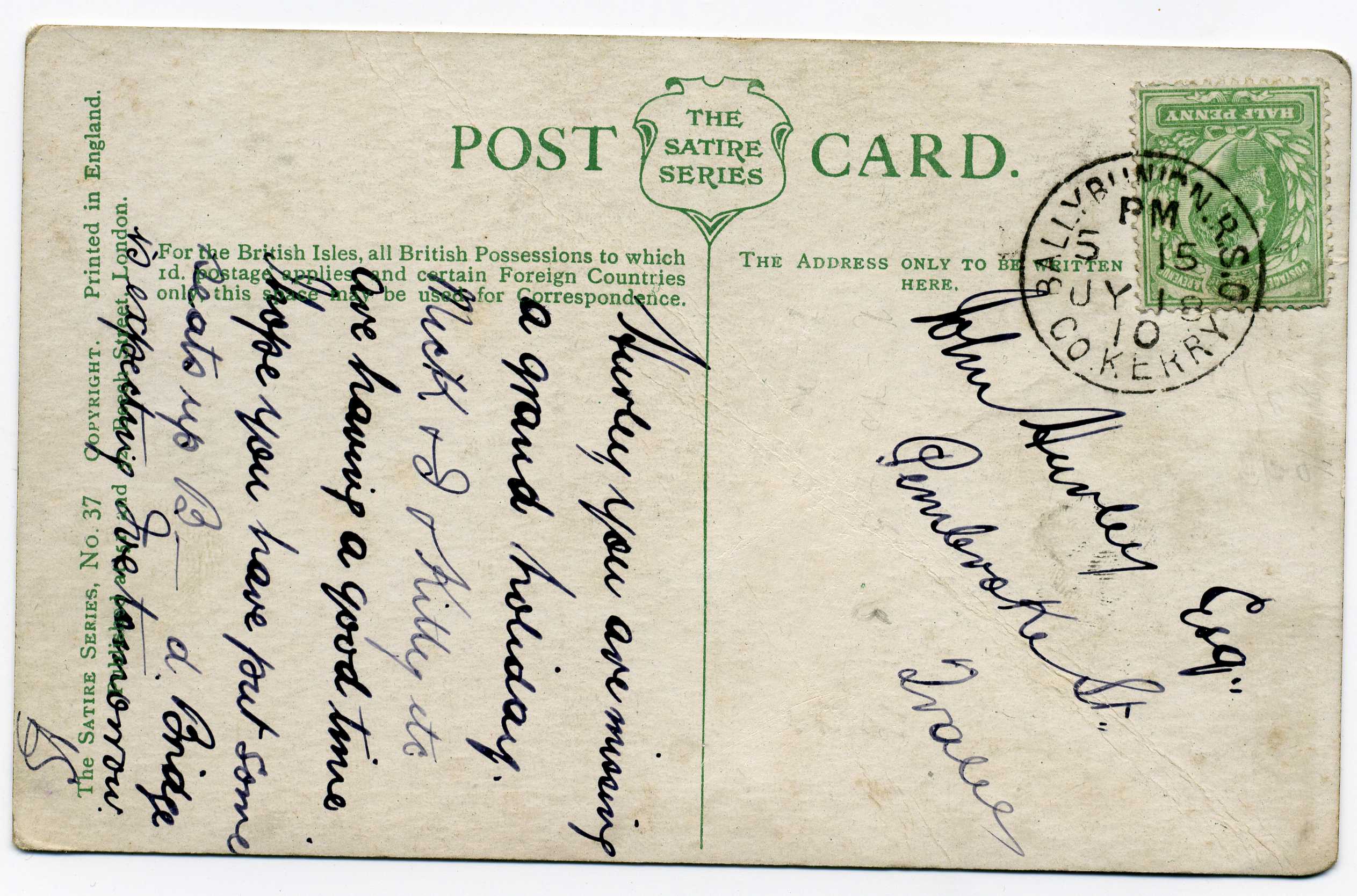 PH014.85 Image | 1910 Humourous Postcard bearing ½d adhesive tied "Ballybunion RSO 10/7/10"