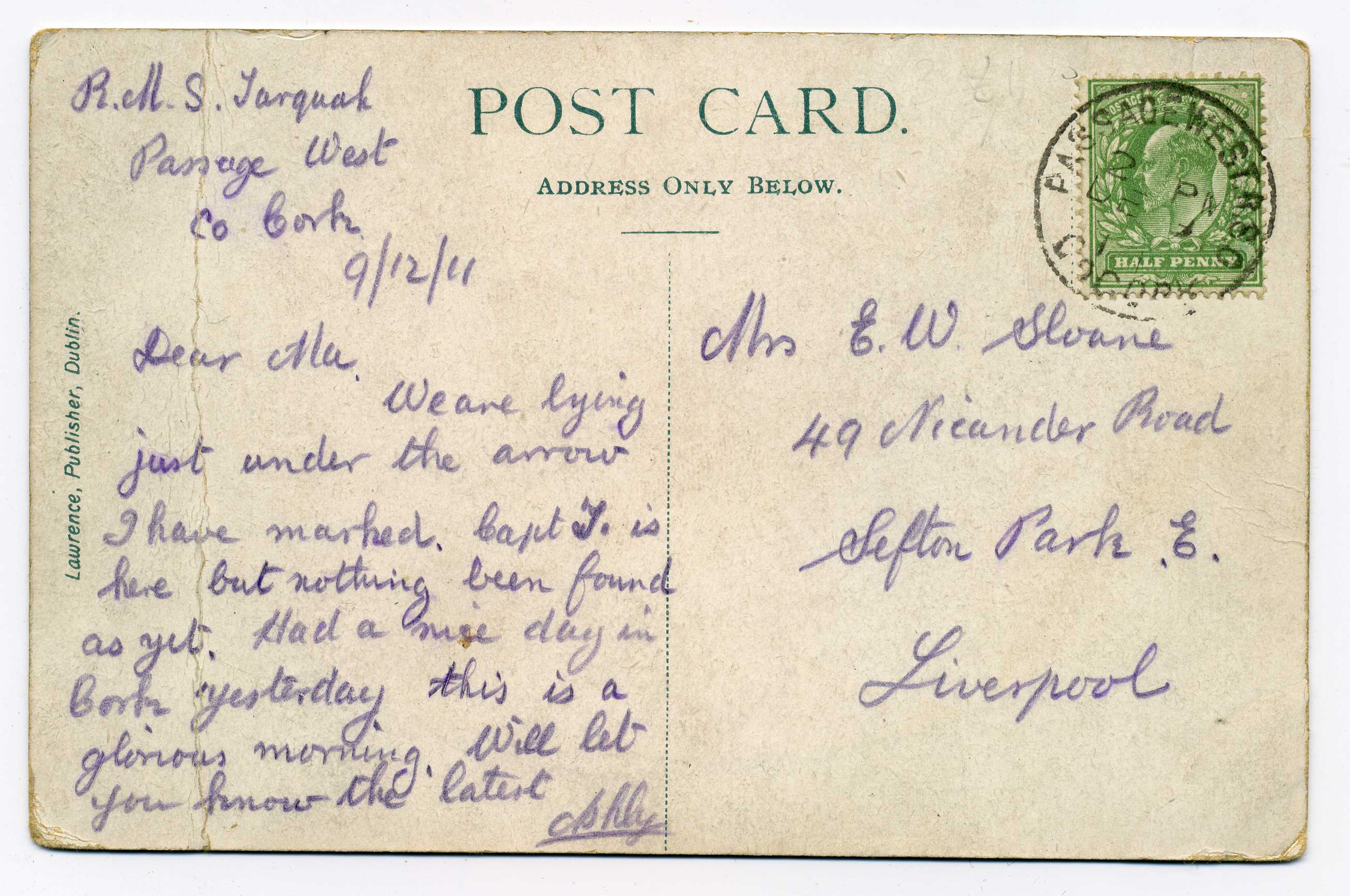 PH015.7 Image | 1911 Picture Postcard bearing ½d adhesive tied by Passage West R.S.O. Co. Cork