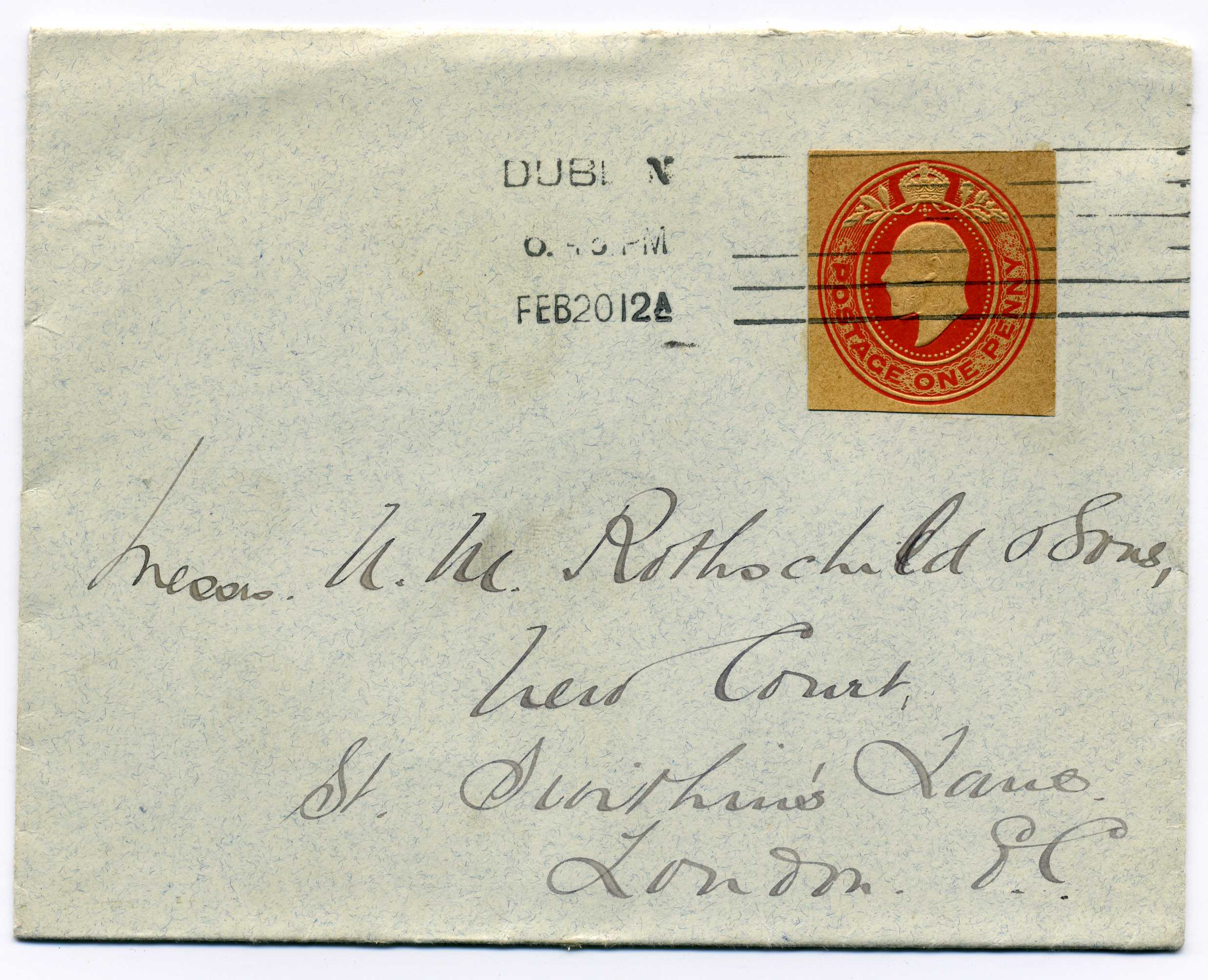 PH015.88 Image | 1912 1d Red Postal Stationery cut out used on cover to London with Dublin machine cancel 20/2/16
