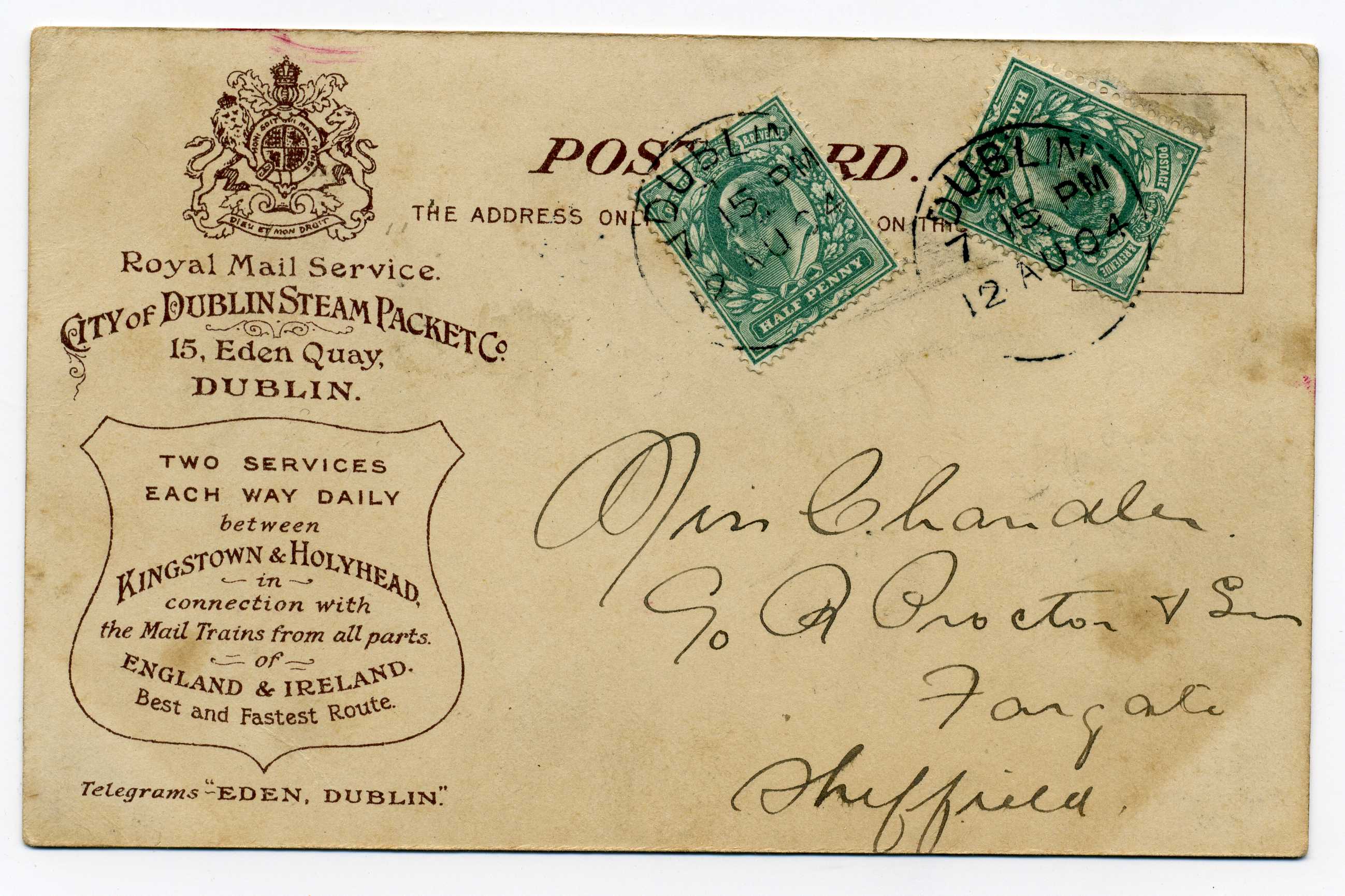 PH015.9 Image | 1912 approx. Advertising Postcard RMS Munster with two ½d adhesives tied by Dublin cds cancels