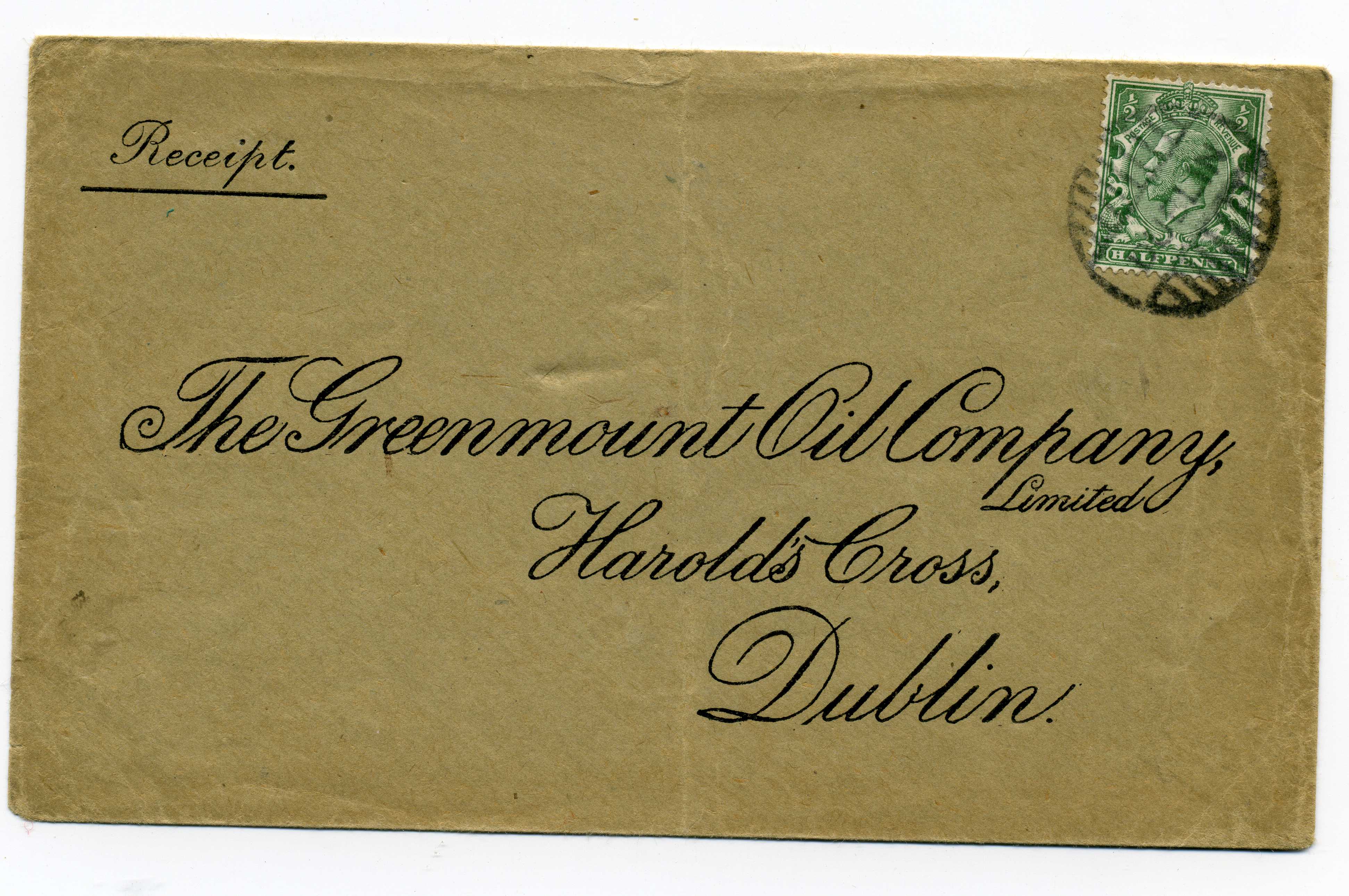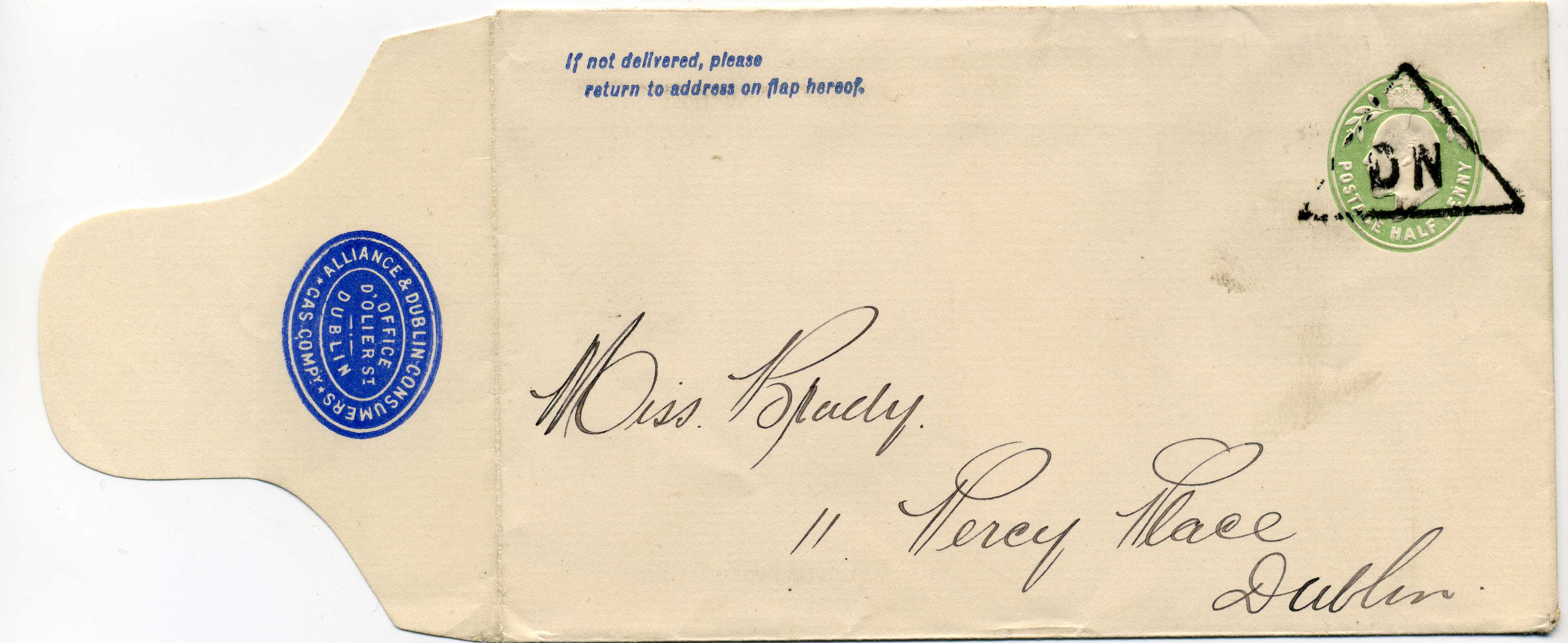 PH017.5 Image | George V Stamped to Order envelope with ½ Green Die stamp tied by triangular DN cancel and printed seal in blue on reverse "Alliance & Dublin Consumers Gas Co"