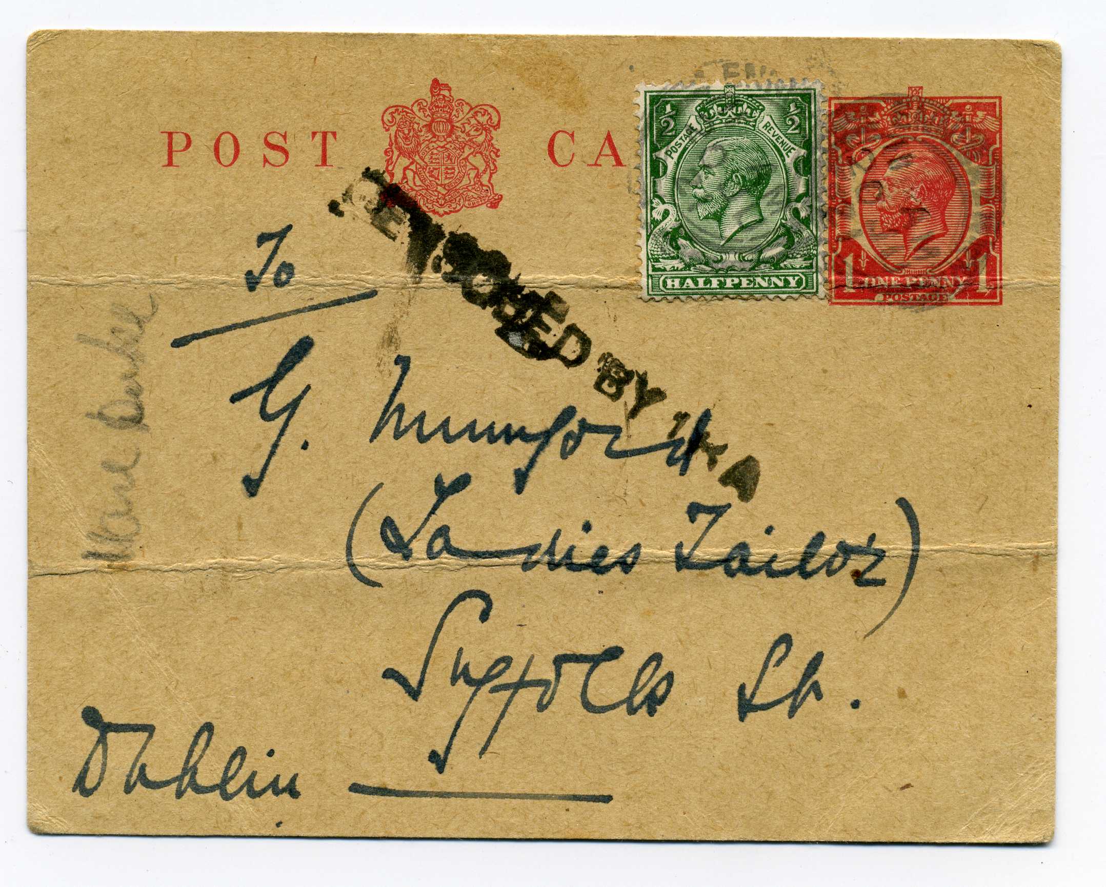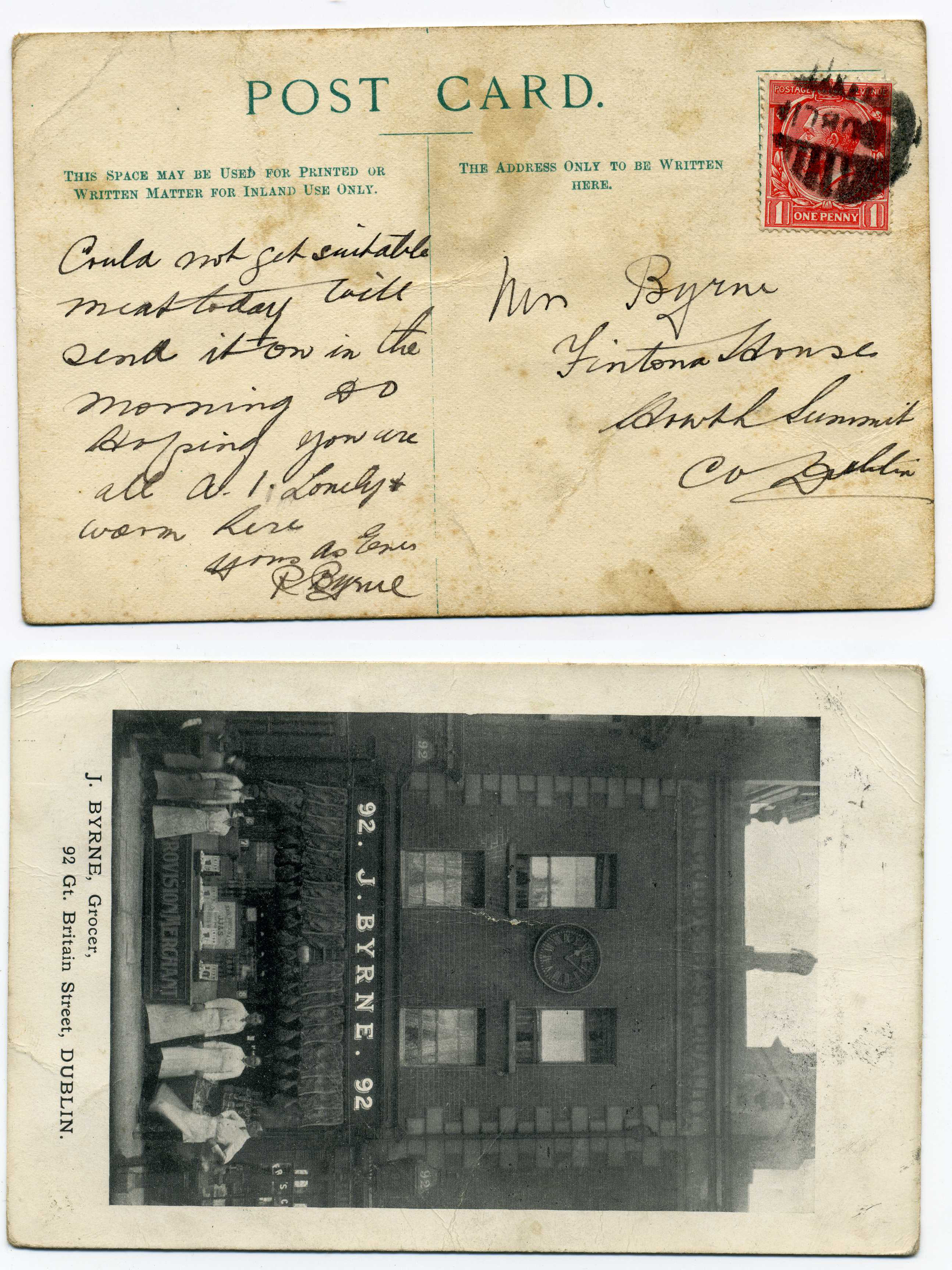PH033.5 Image | 1916 Advertising Postcard "J Byrne Grocer, 92 Gt. Britain St." used to Howth bearing 1d adhesive tied by very good strike Dublin Emergency Barred cancel used after 1916 Easter Rising