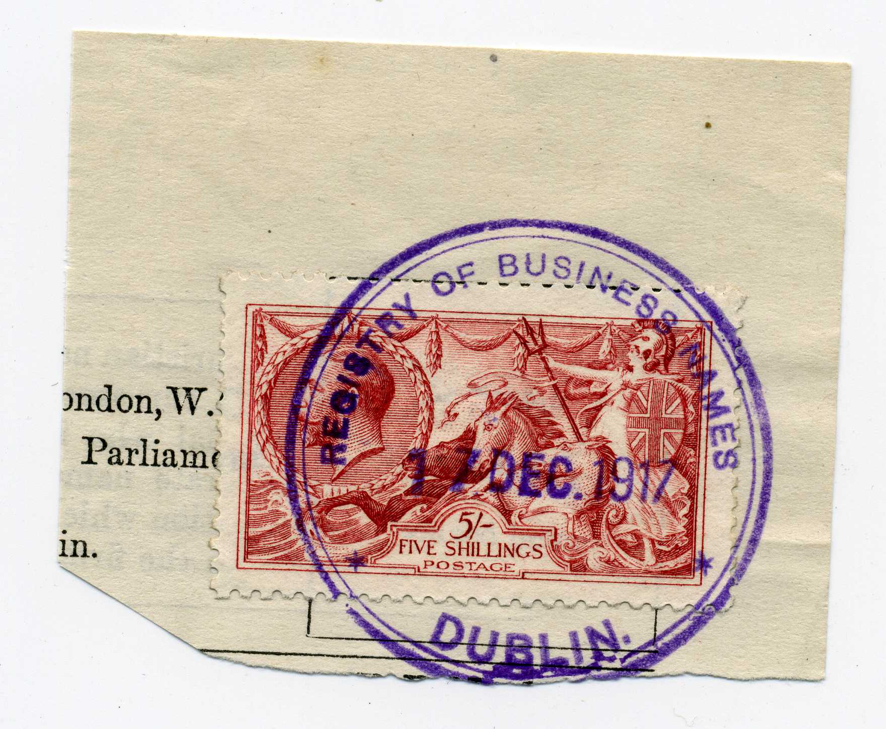 1917 GB 5 shilling Seahorse used on piece with superb strike Registry of Business Names Dublin, a rare stamp used in Ireland |