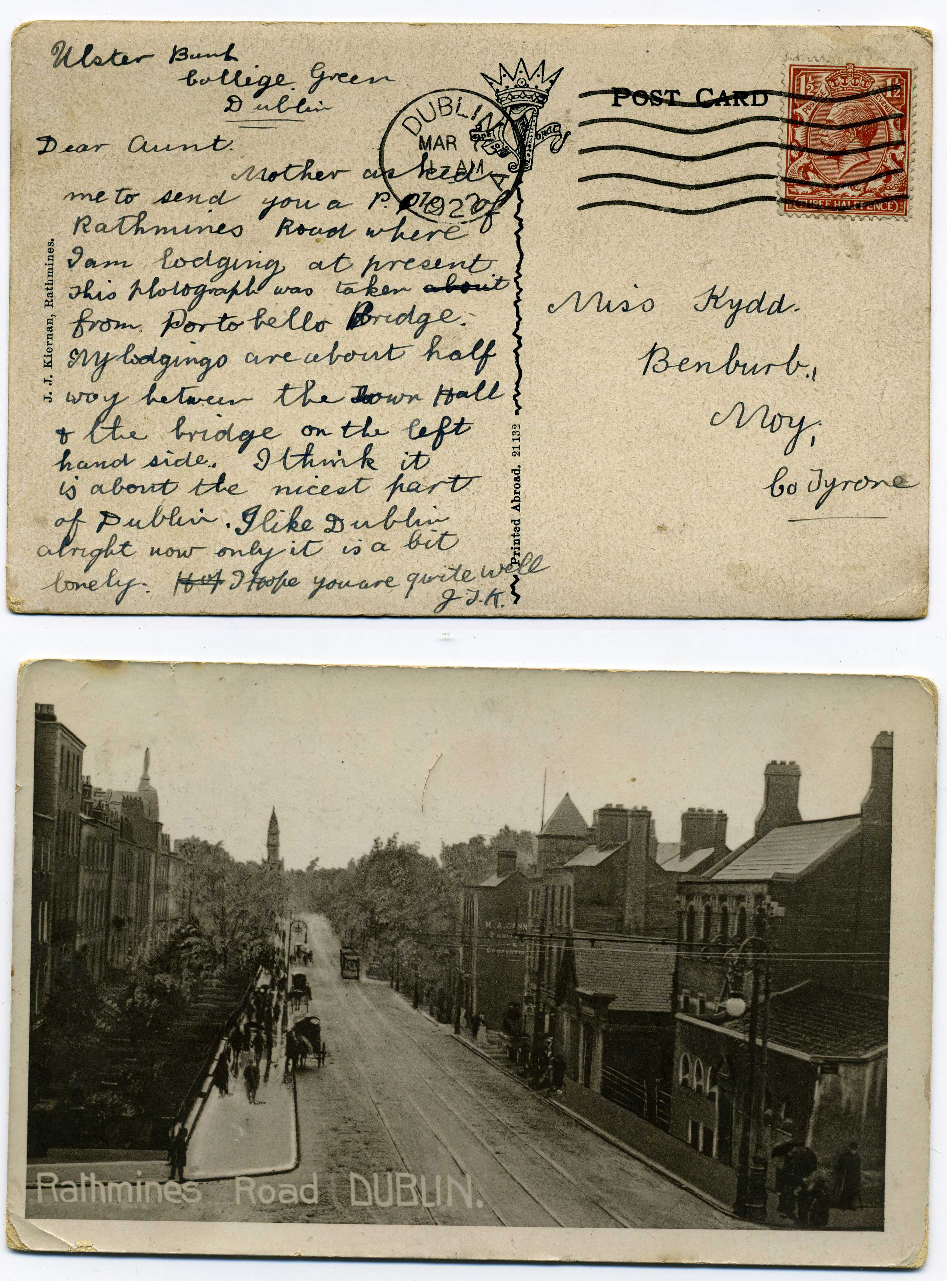 PH040 Image | 1922 March 7th Real Imagegraphic Postcard Rathmines Road Dublin used with GB 1½d tied by Dublin machine cancel, an excellent Transition use and scarce.