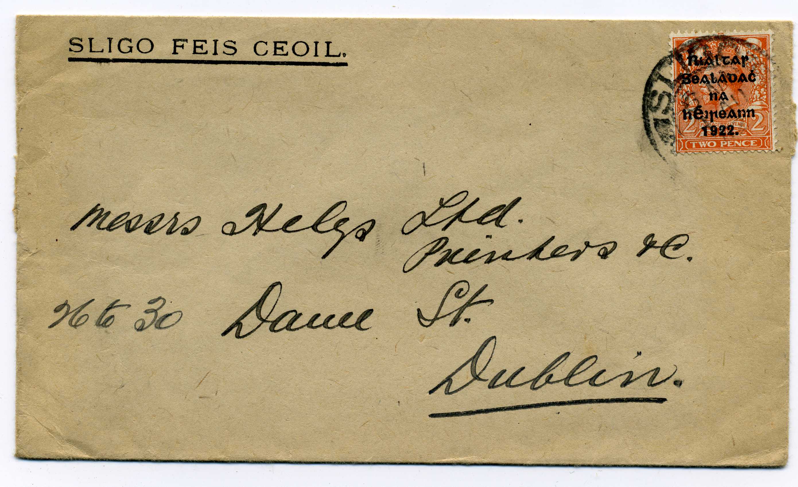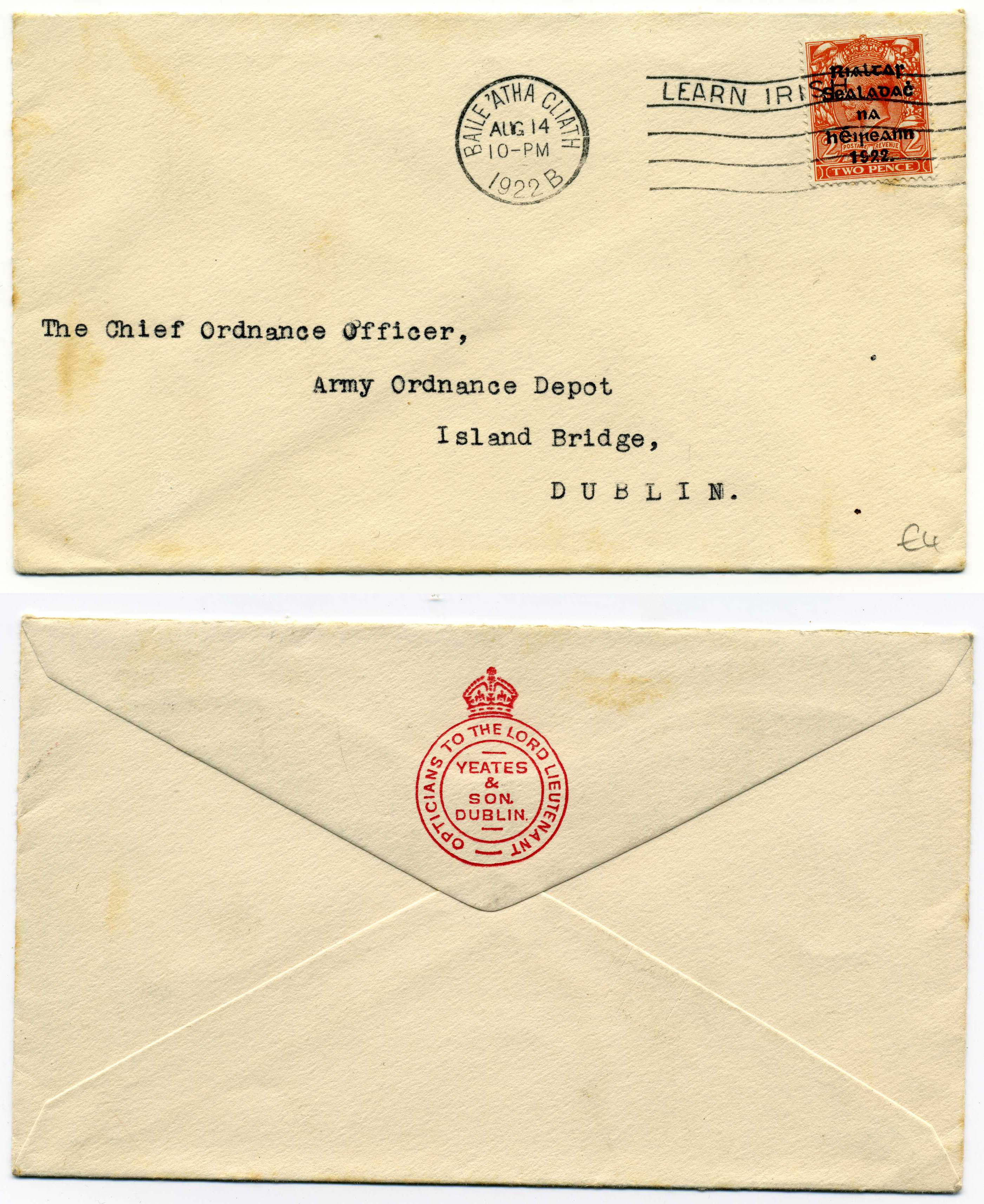 PH041.3 Image | 1922 Aug. 14th Cover bearing 2d Thom overprint tied by Learn Irish slogan cancel, crest on reverse "Yeats & Son Dublin Opticians to the Lord Lieutenant" an attractive cover