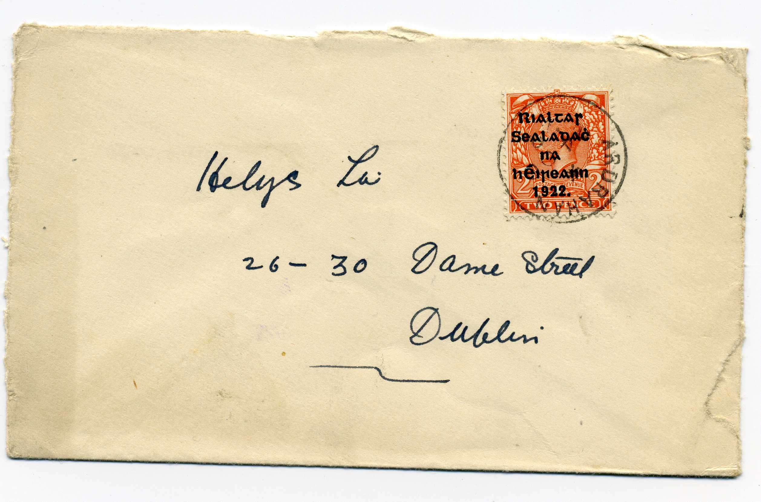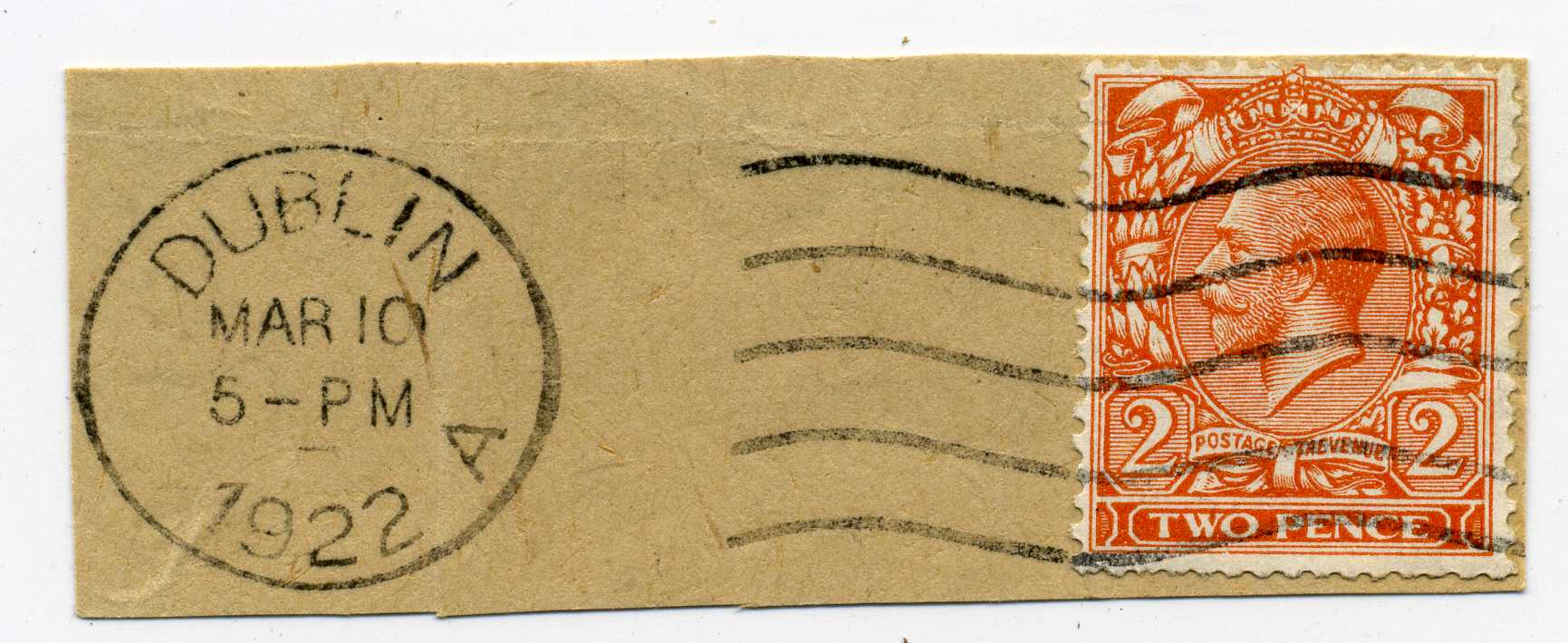 PH041.35 Image | 1922 March 10th Piece bearing unoverprinted 2d Orange tied by Dublin machine cancel, an attractive transition use.