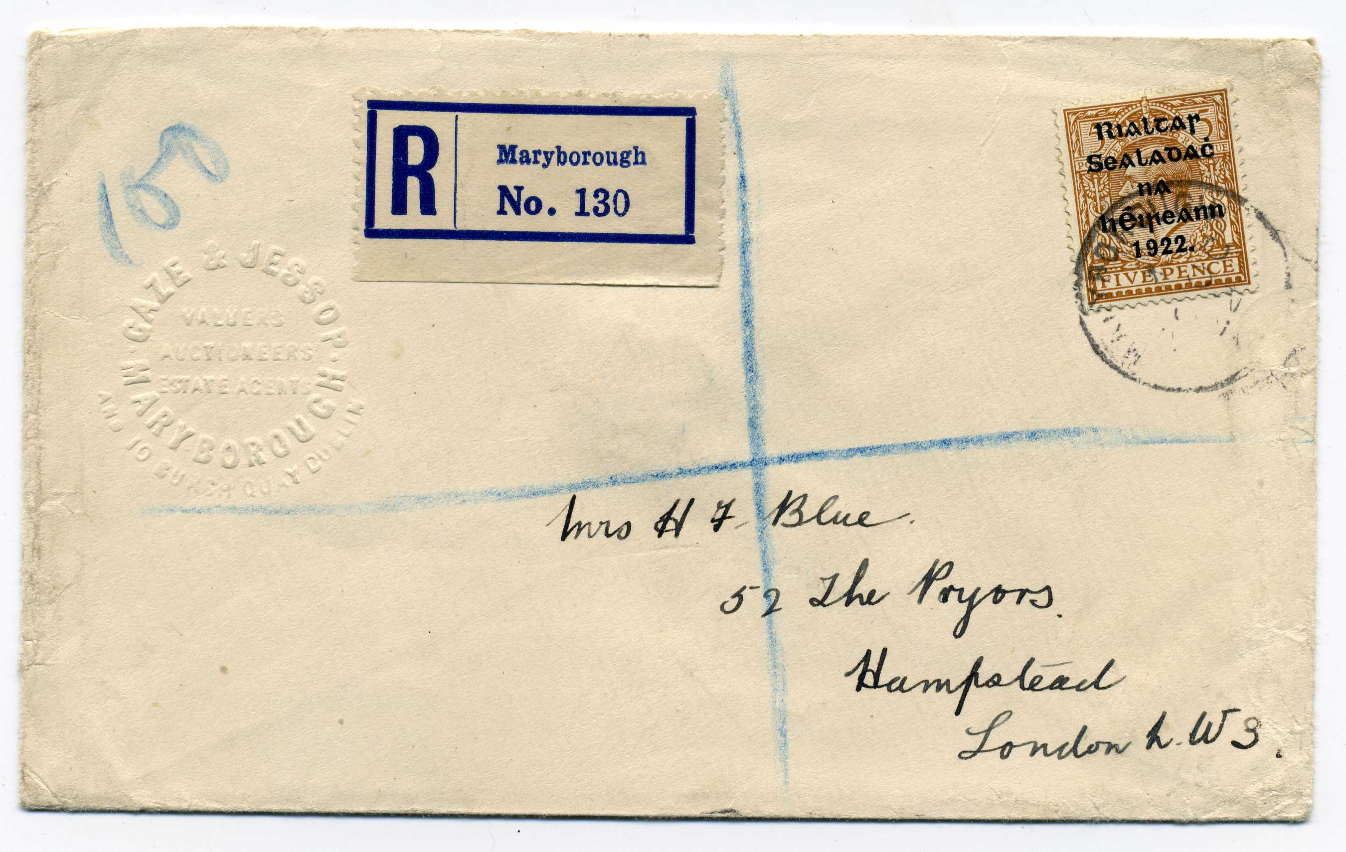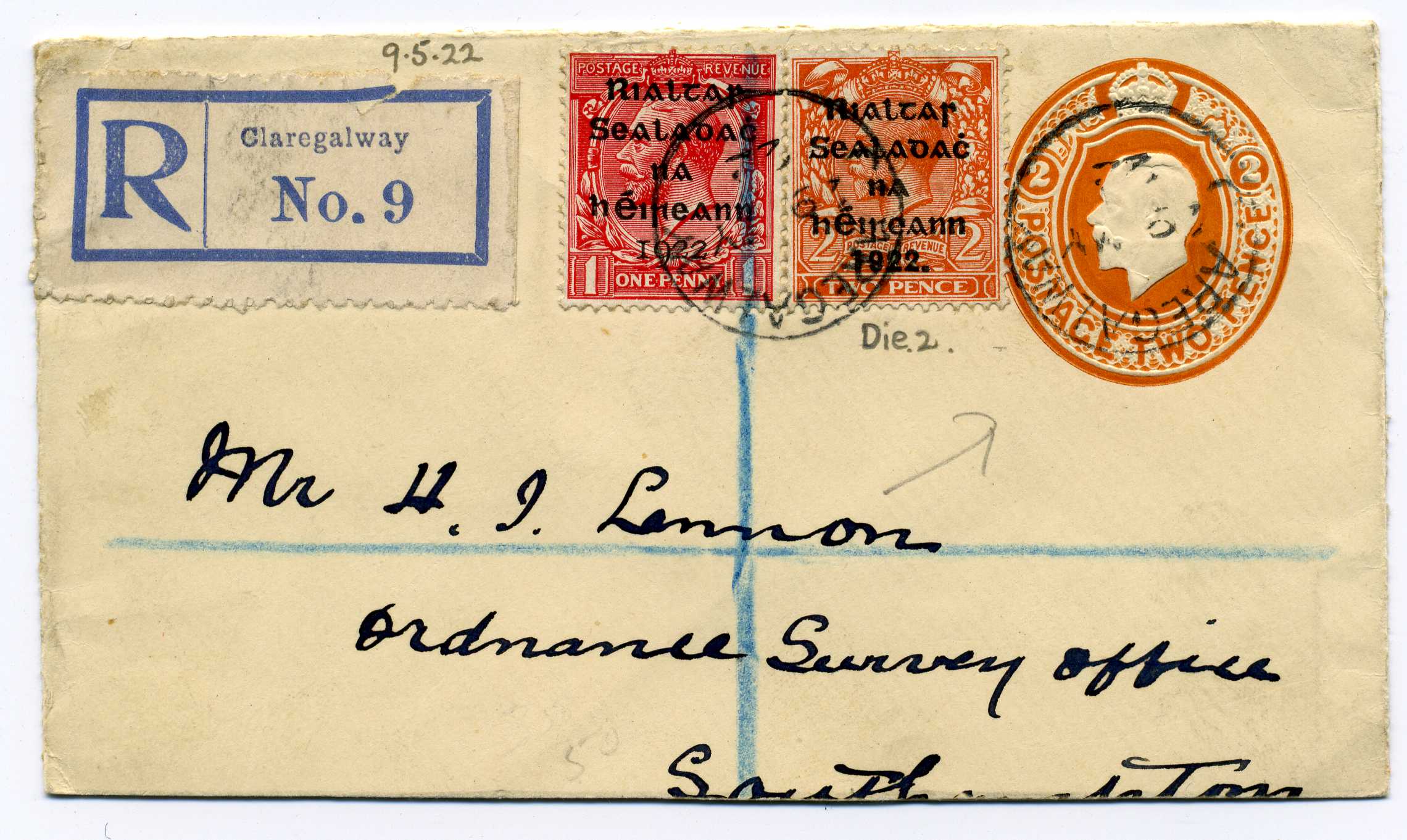 PH041 Image | 1922 May 29th Cut Down 2d Postal Stationery Envelope plus 1d Dollard and 2d Thom Black to make up the 5d ragistered rate used from Claregalway