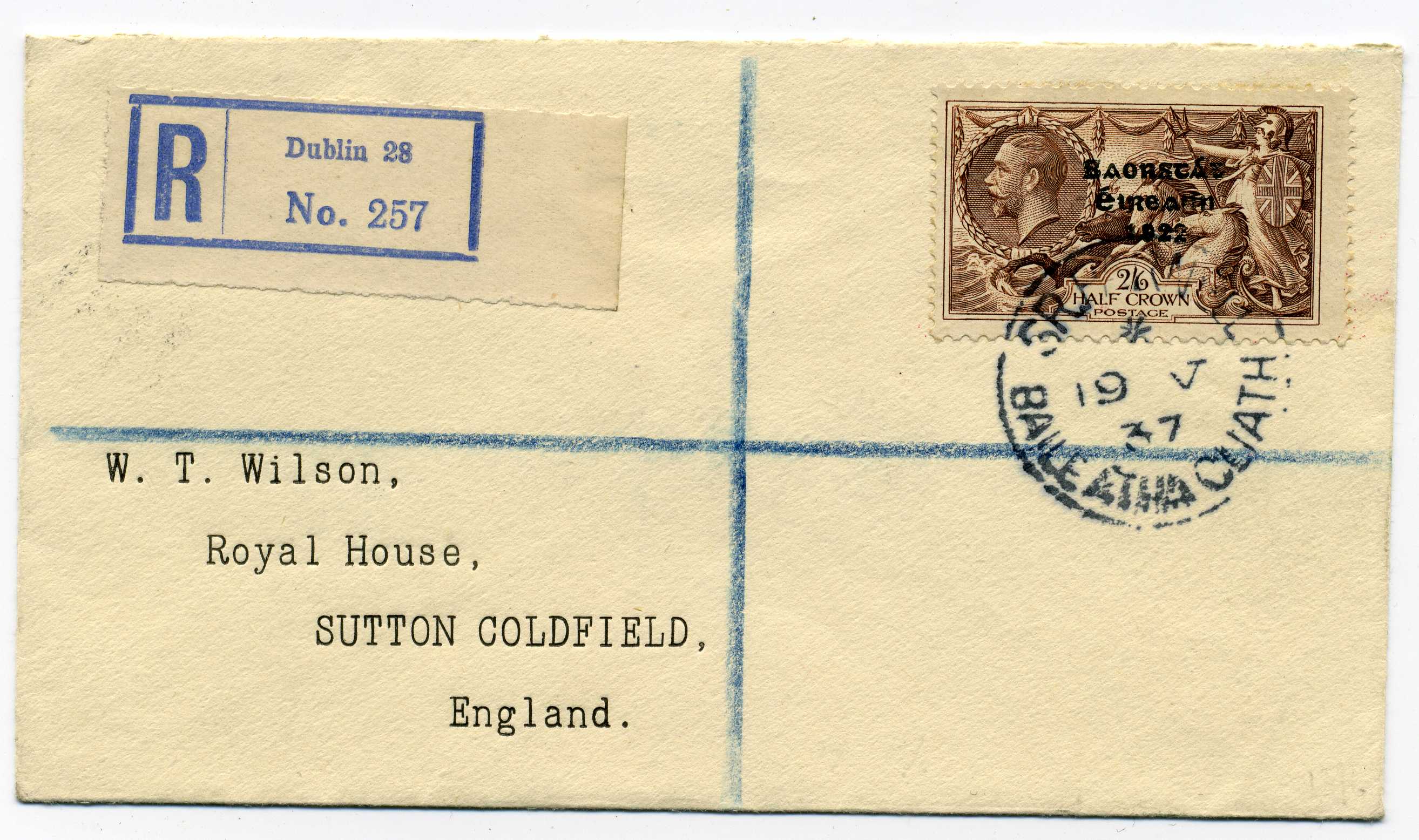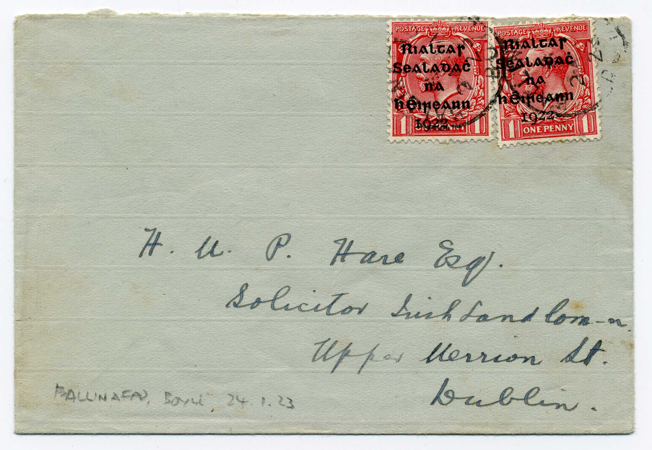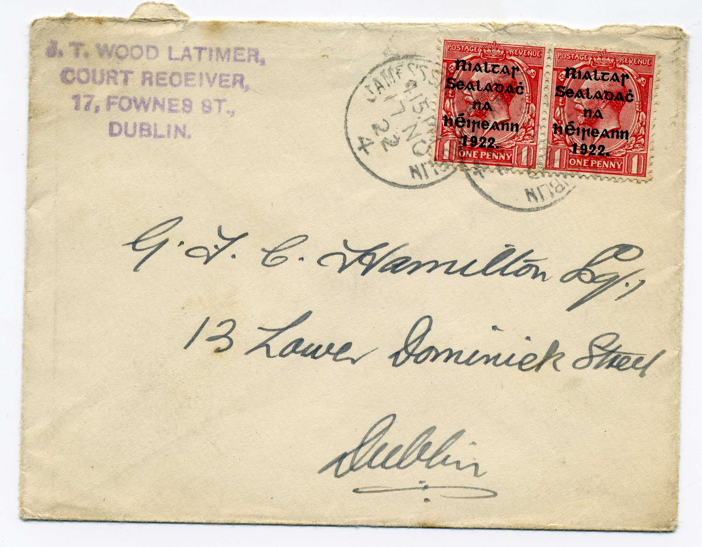 PH044.03 Image | 1922 Cover with rubber stamp "J T Wood Latimer Court Receiver" used with pair Thom 1d tied James Street Dublin cds 17/11/22