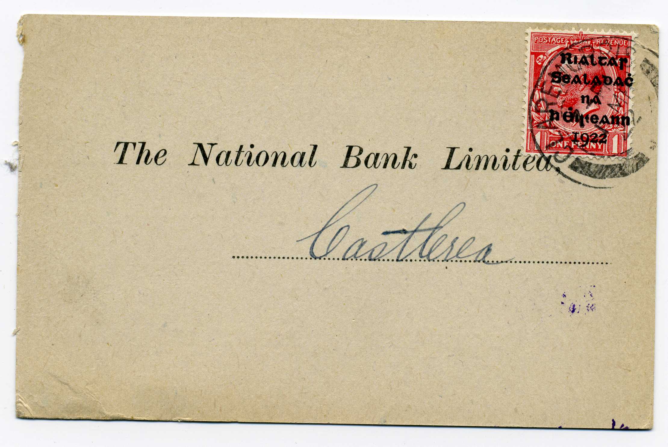 PH041.4 Image | 1922 Cover with embossed crest National Bank Ltd. Claremorris bearing Thom Black 2d tied by Claremorris cds
