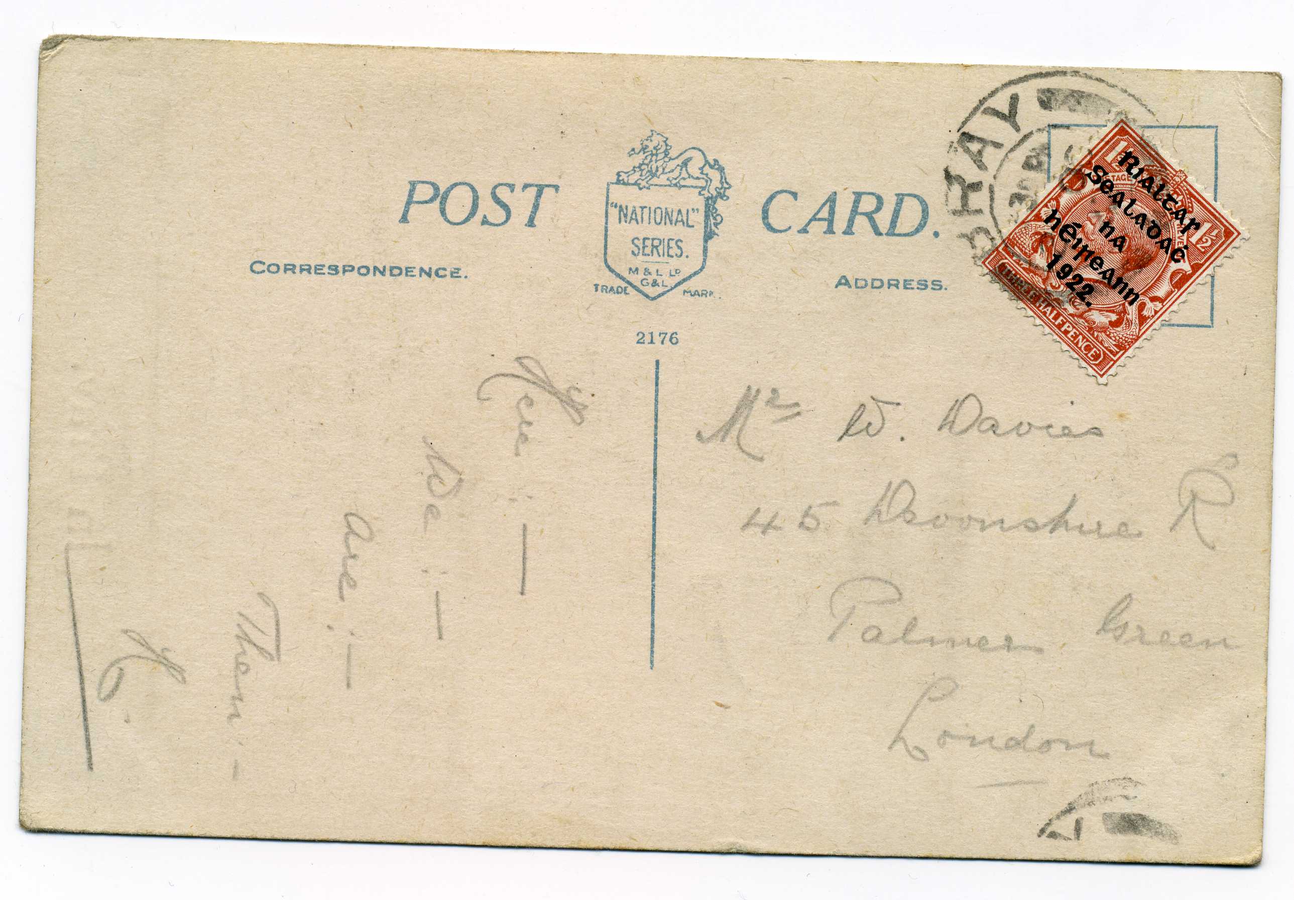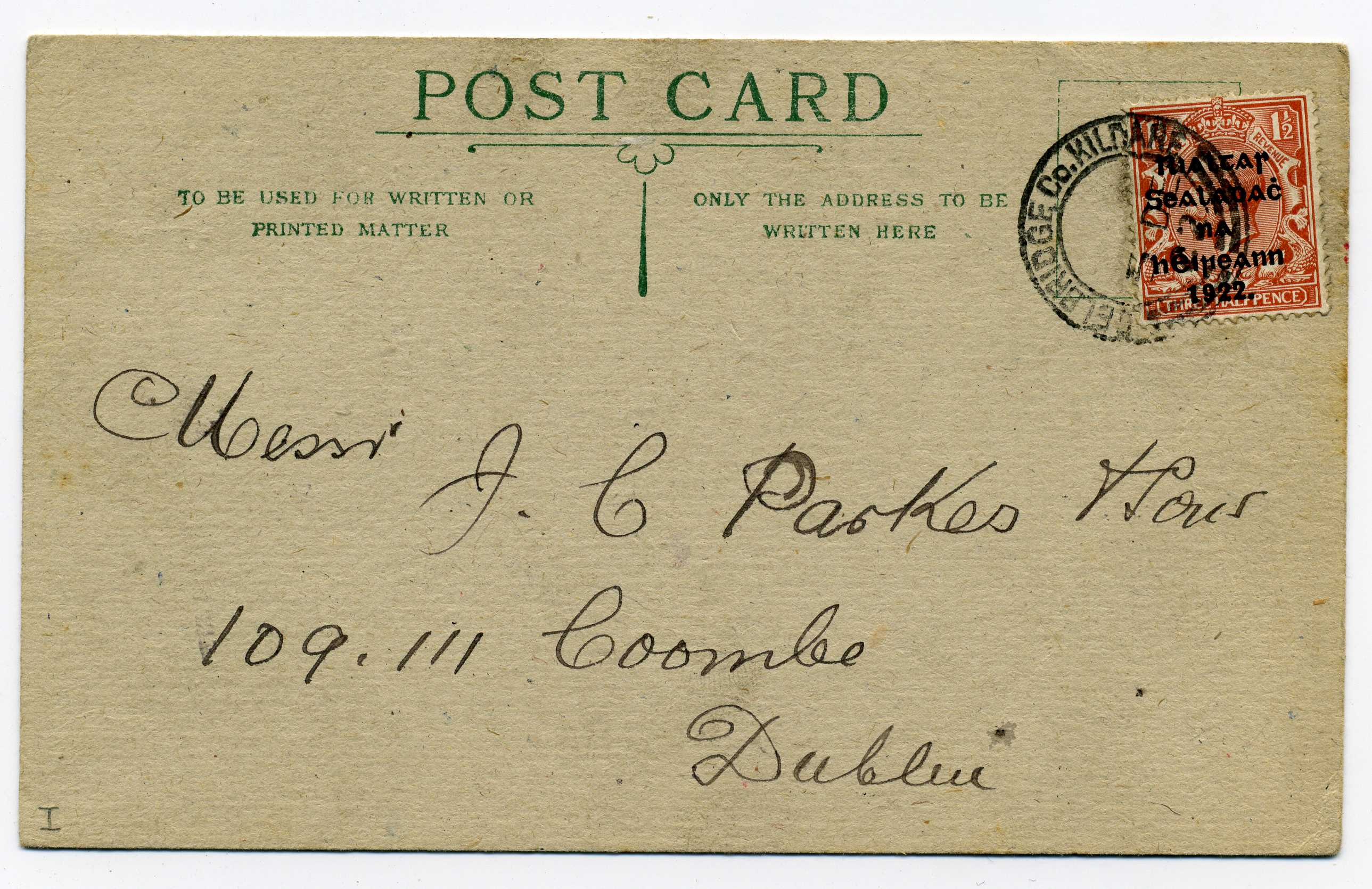 PH044.02 Image | 1922 Postcard bearing Thom 1½d overprint tied by small sized double ring Celbridge Co. Kildare cds