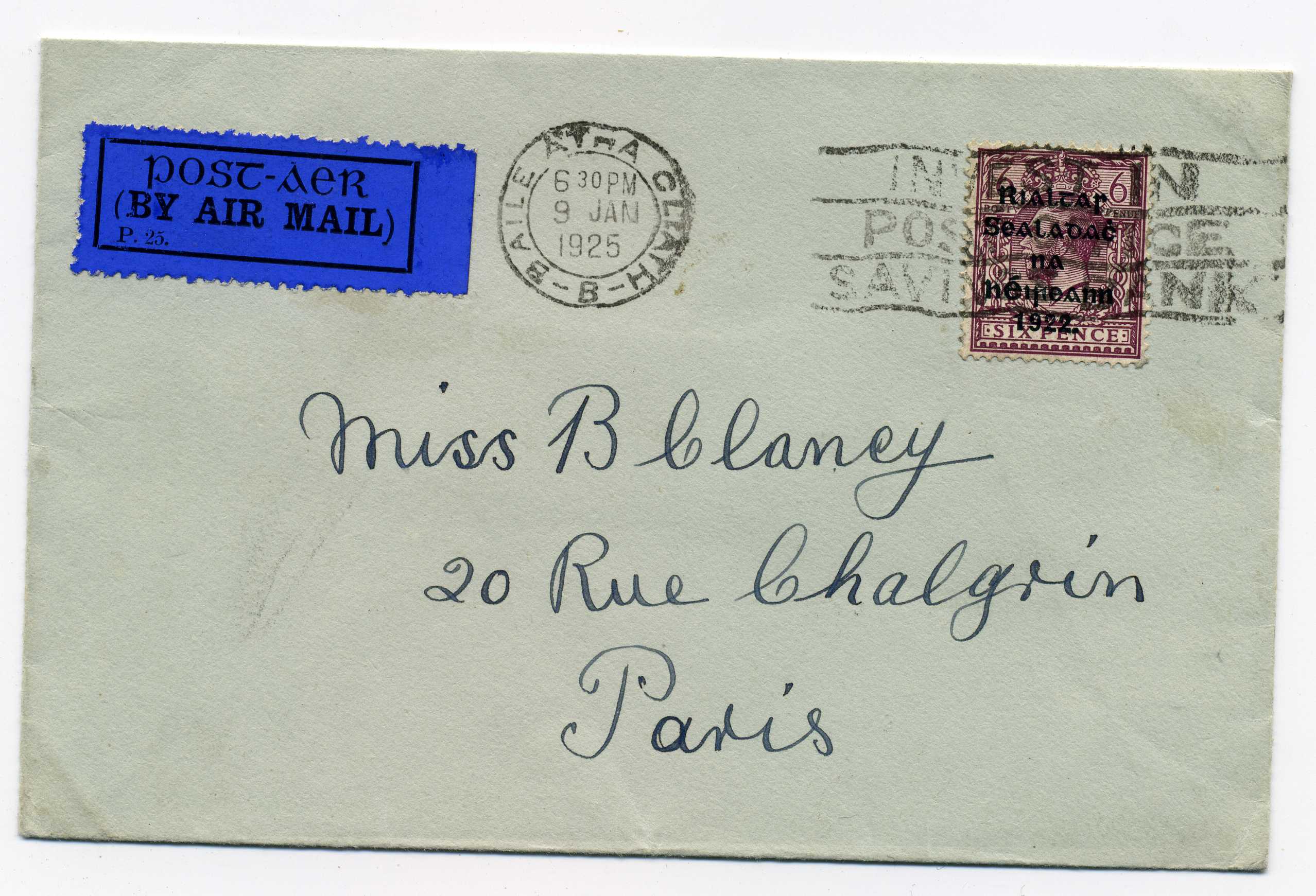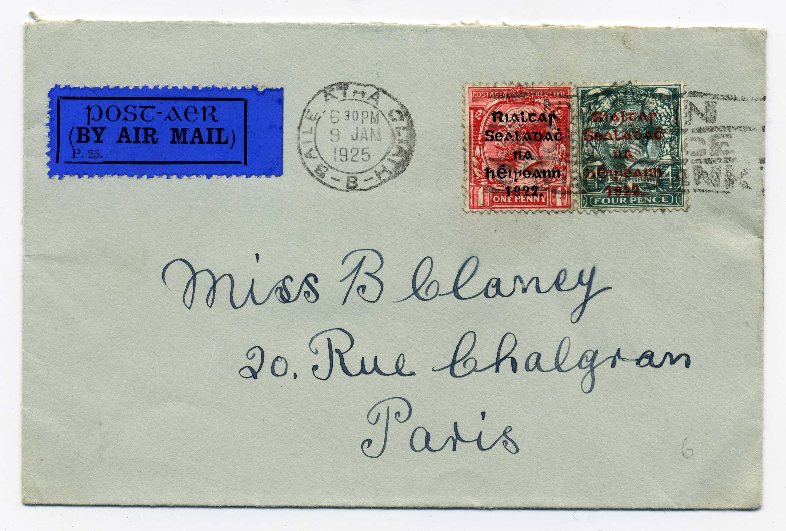 PH045 Image | 1925 Airmail Cover to Paris bearing Thom 6d tied by Baile Atha Cliath slogan cancel