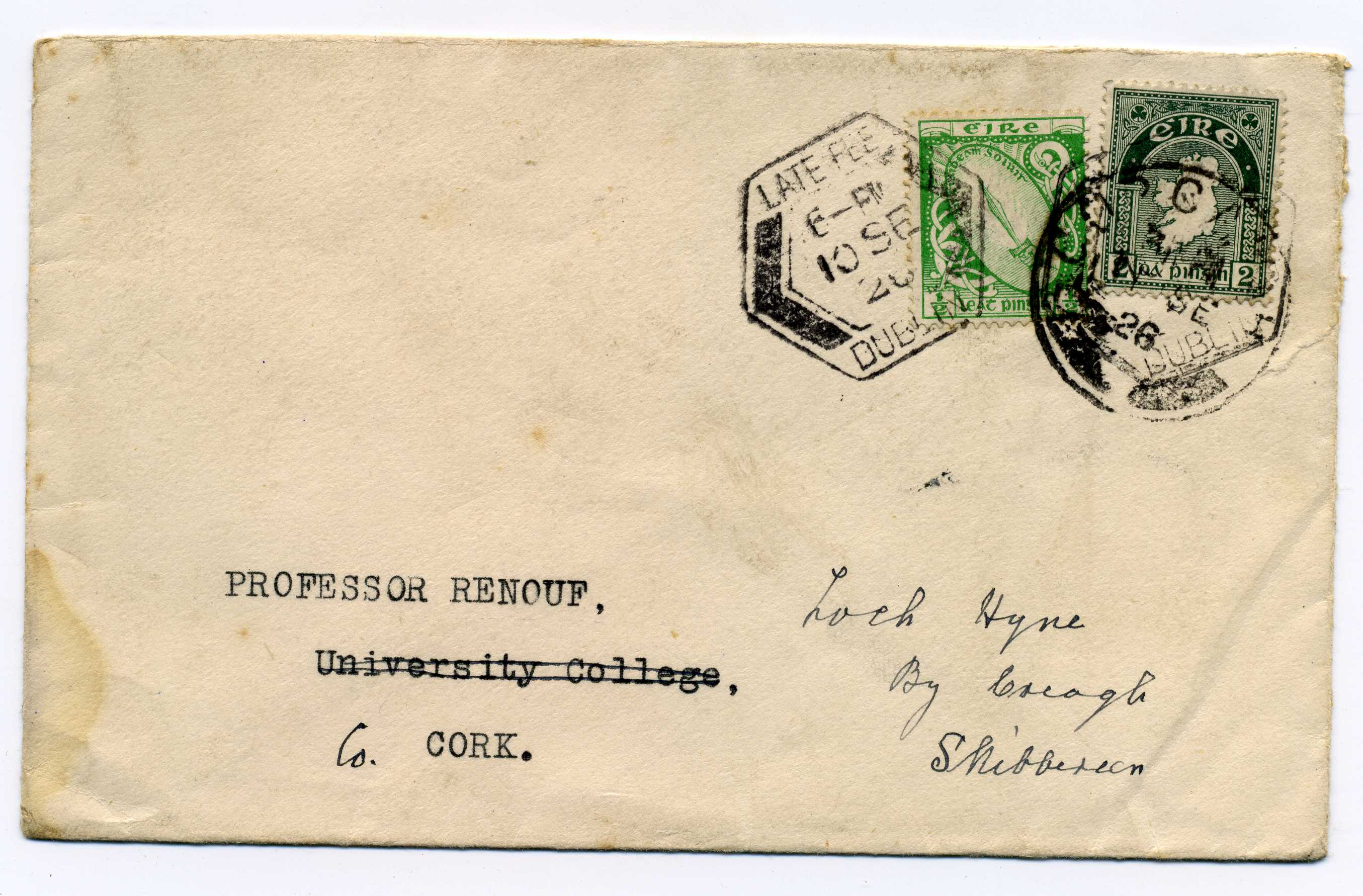PH047 Image | 1926 Cover addressed to Skibereen bearing ½d and 2d adhesives tied by 2 strikes of hexagonal "Late Fee Dublin" cancel