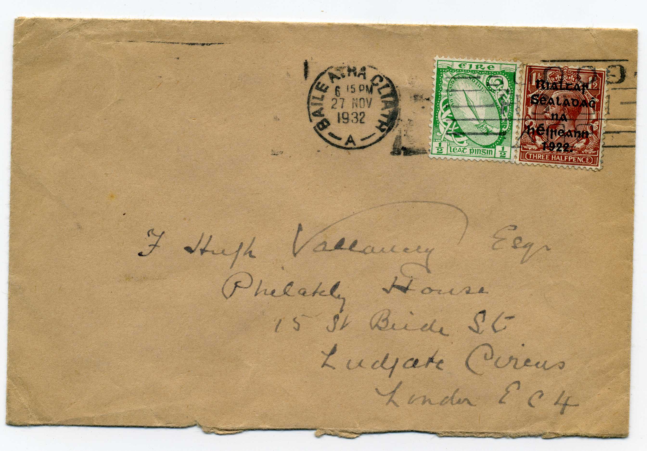 PH049.55 Image | 1932 Cover addressed to London bearing SE ½d definitive and Harrison 5 Line 1½d coil both tied by Dublin slogan cancel, a scarce usage of the 1½d value