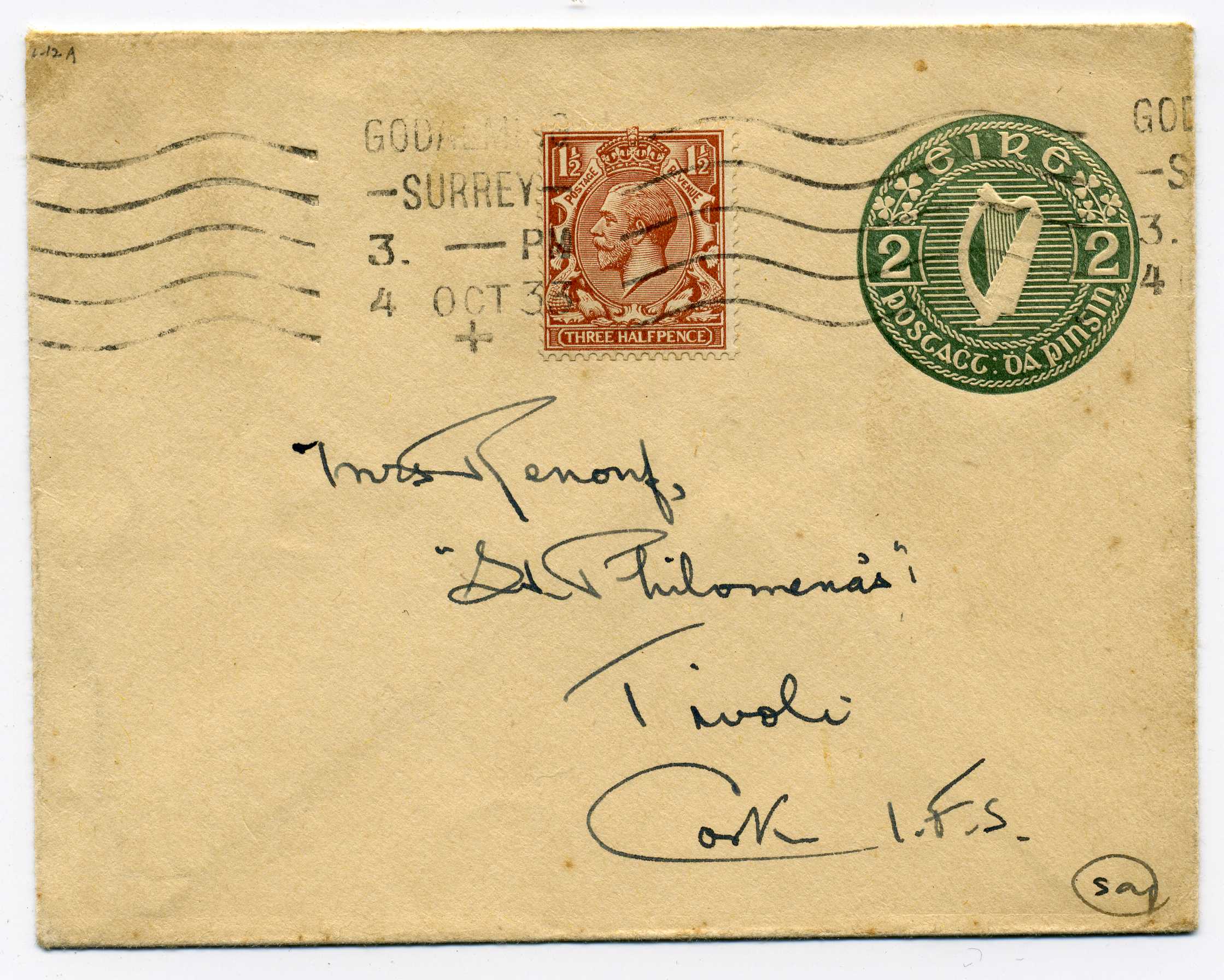 PH049.7 Image | 1933 2d Postal Stationery Envelope (FAI U1G) with GB 1½d adhesive used from Surrey (Godalming machine cancel) to Cork, an unusual usage and contrary to regulations
