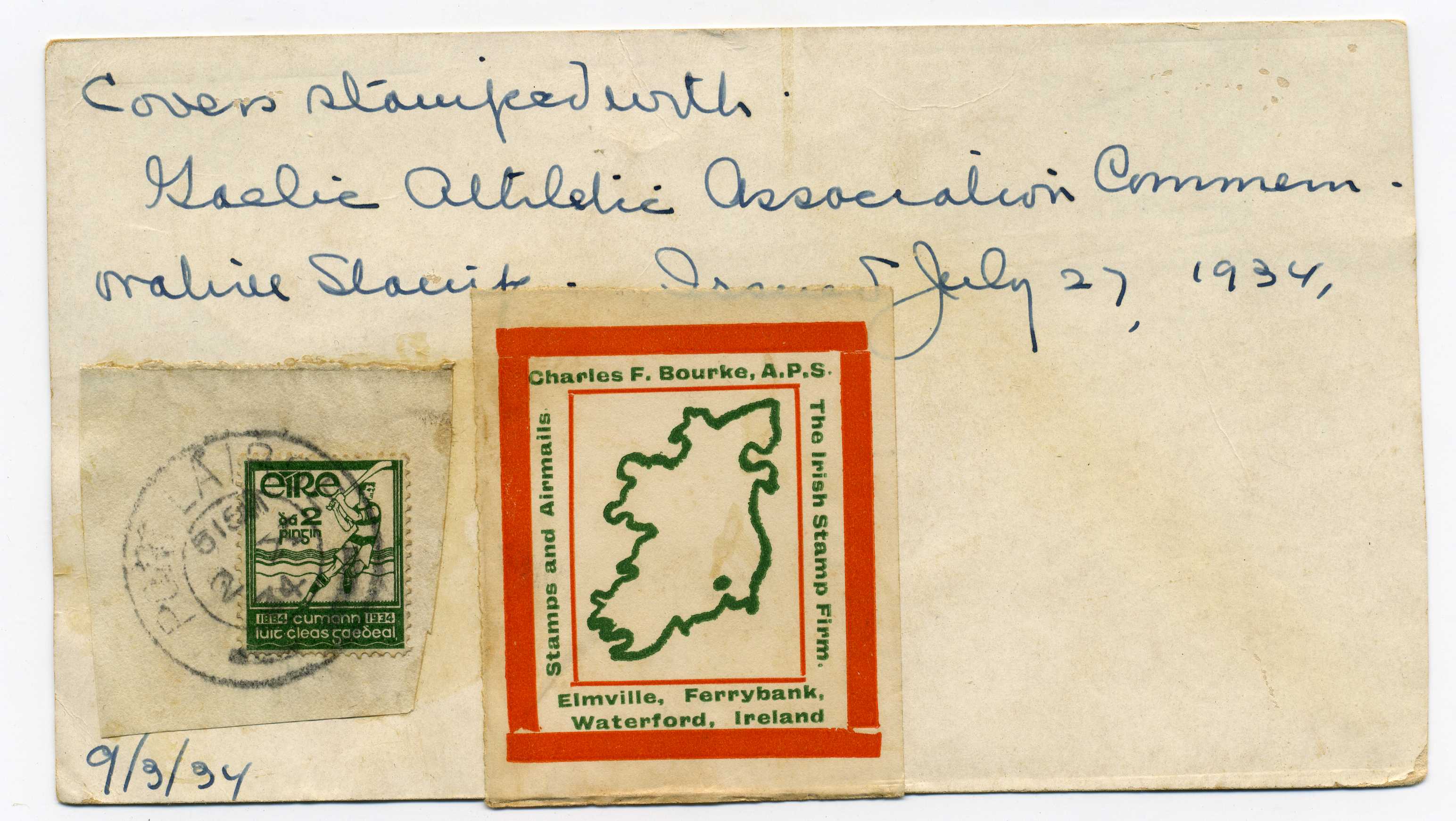 PH049.75 Image | 1934 GAA stamp used on piece stuck on postcard with advertising seal Charles F Bourke Waterford (a noted FDC supplier of the time) alongside.