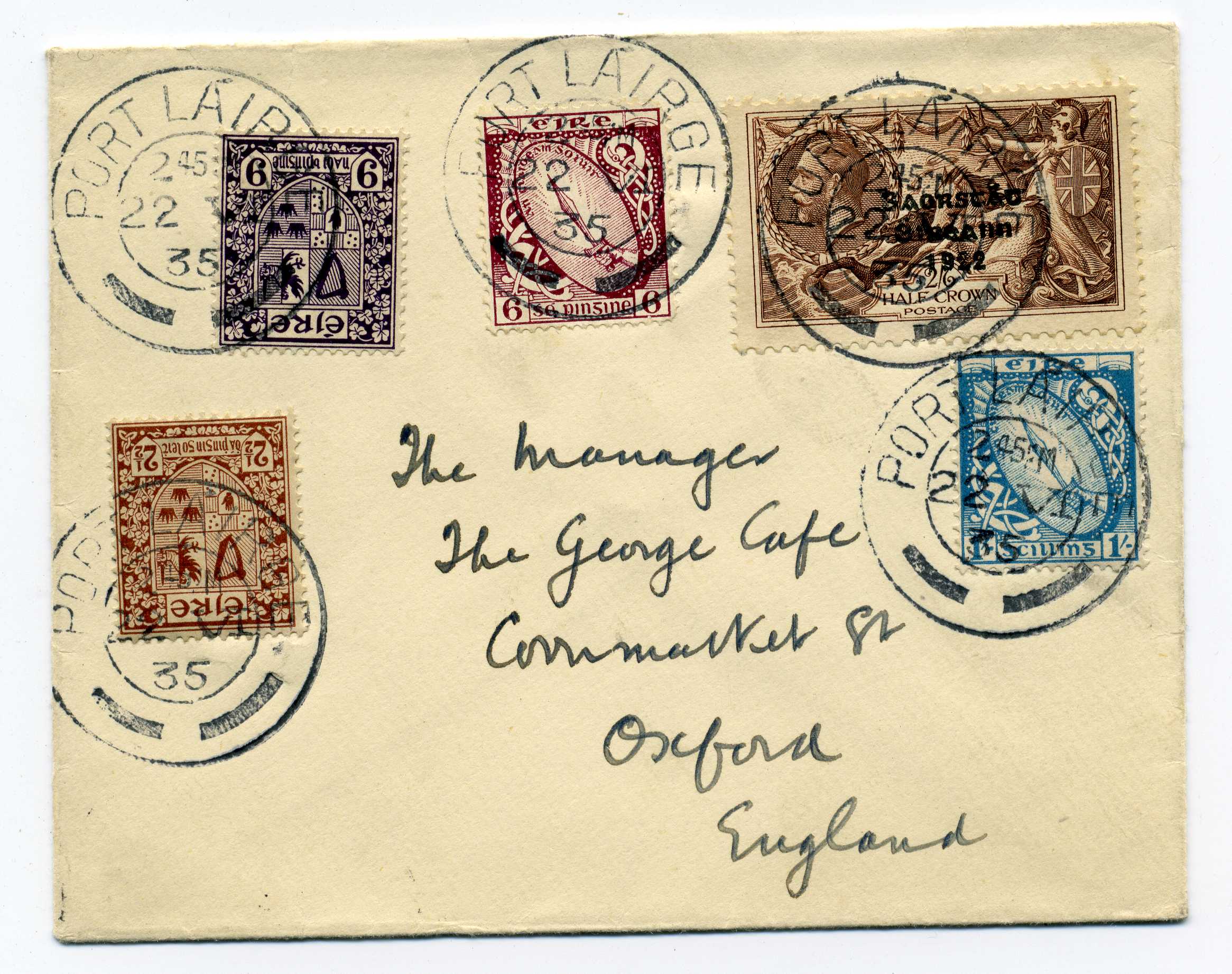 PH049.8 Image | 1935 Cover addressed to Oxford bearing Re Engraved 2-6d value plus SE 2½d, 6d, 9d and 1 shilling all tied by Port Lairge cds 22/6/35, an early usage of the 2-6d