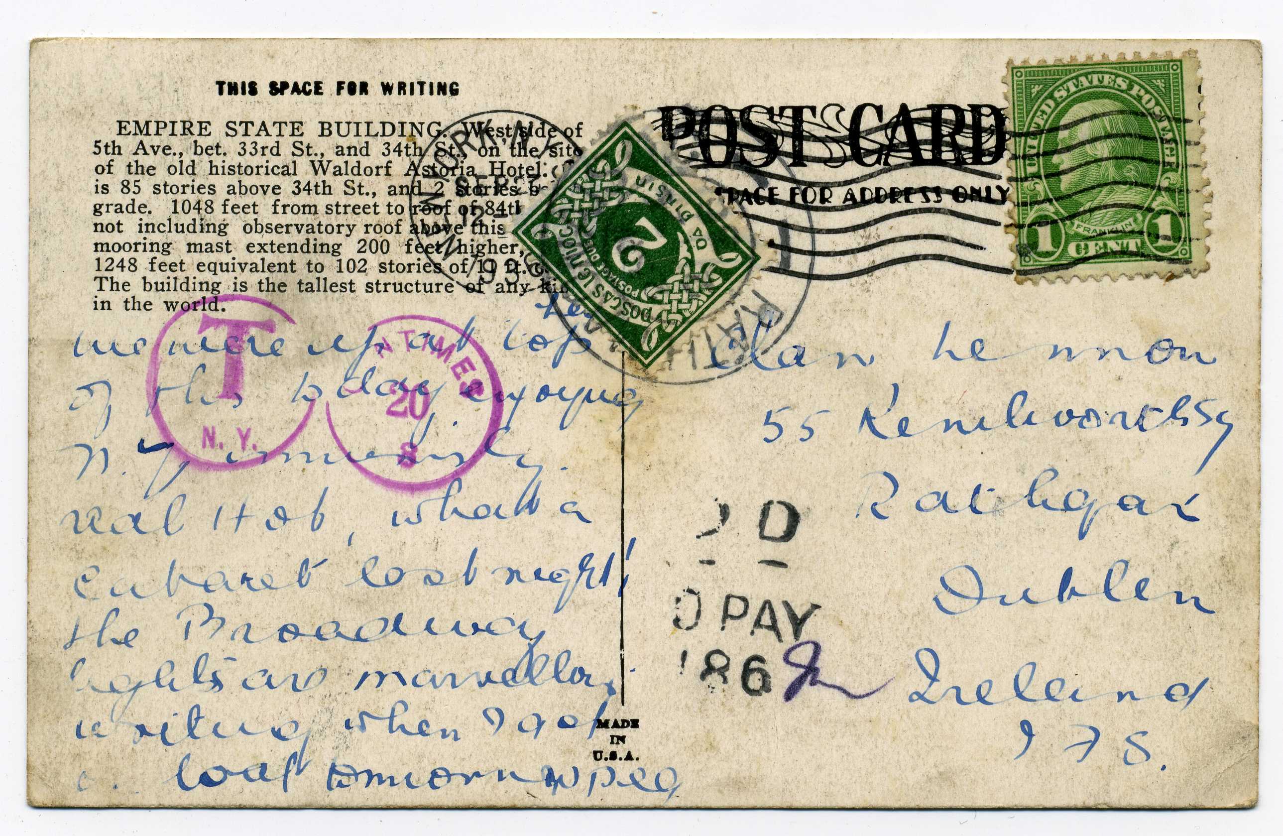 PH049.95 Image | 1936 Picture Postcard from USA bearing "2d To Pay 186" handstamp the charge collected by 2d SE Postage Due tied by Rathmines cds