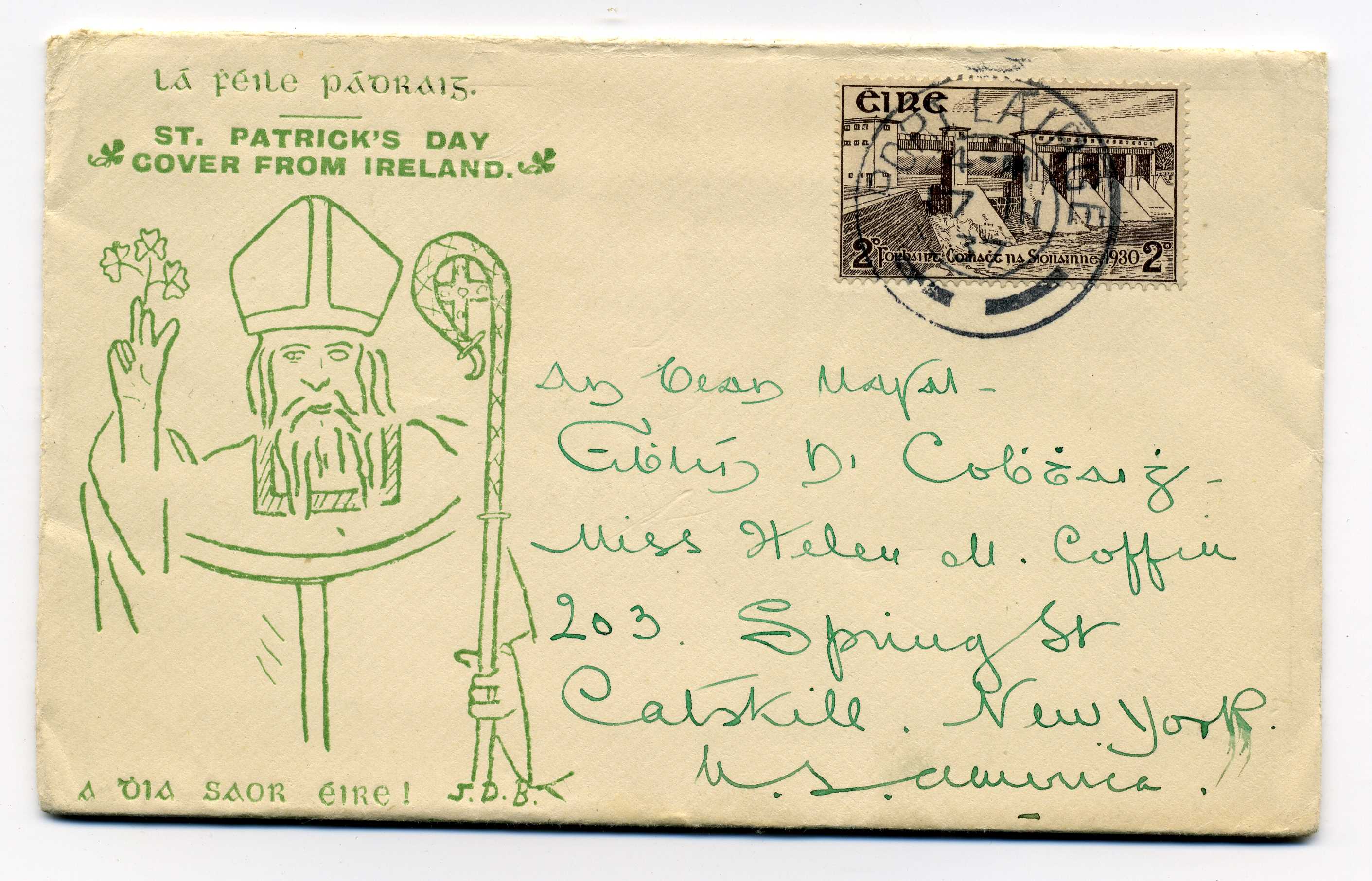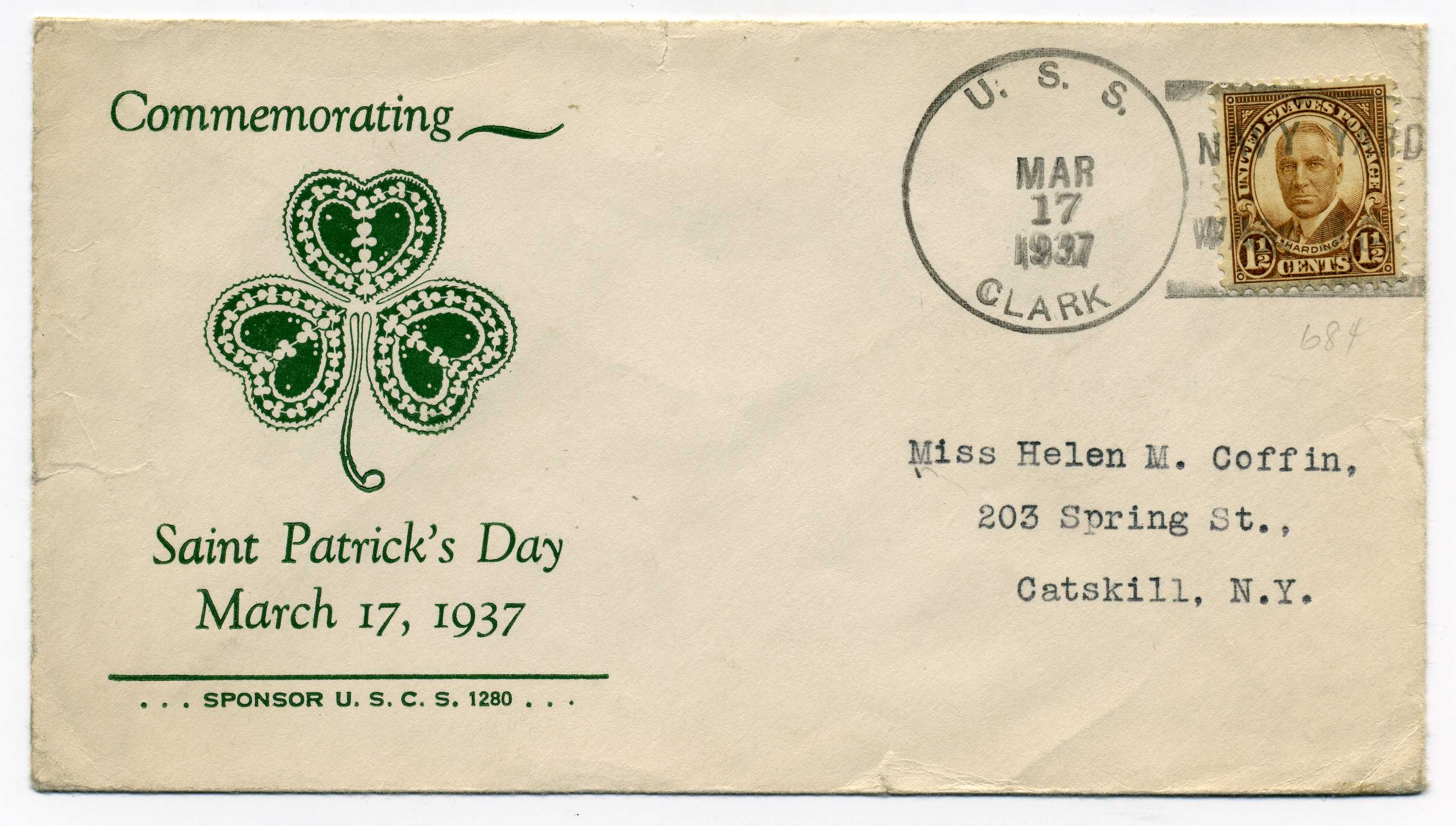PH054 Image | 1937 St. Patrick's Day souvenir cover bearing USA 2 cent adhesive tied by USS Clark cancel 17/3/37.