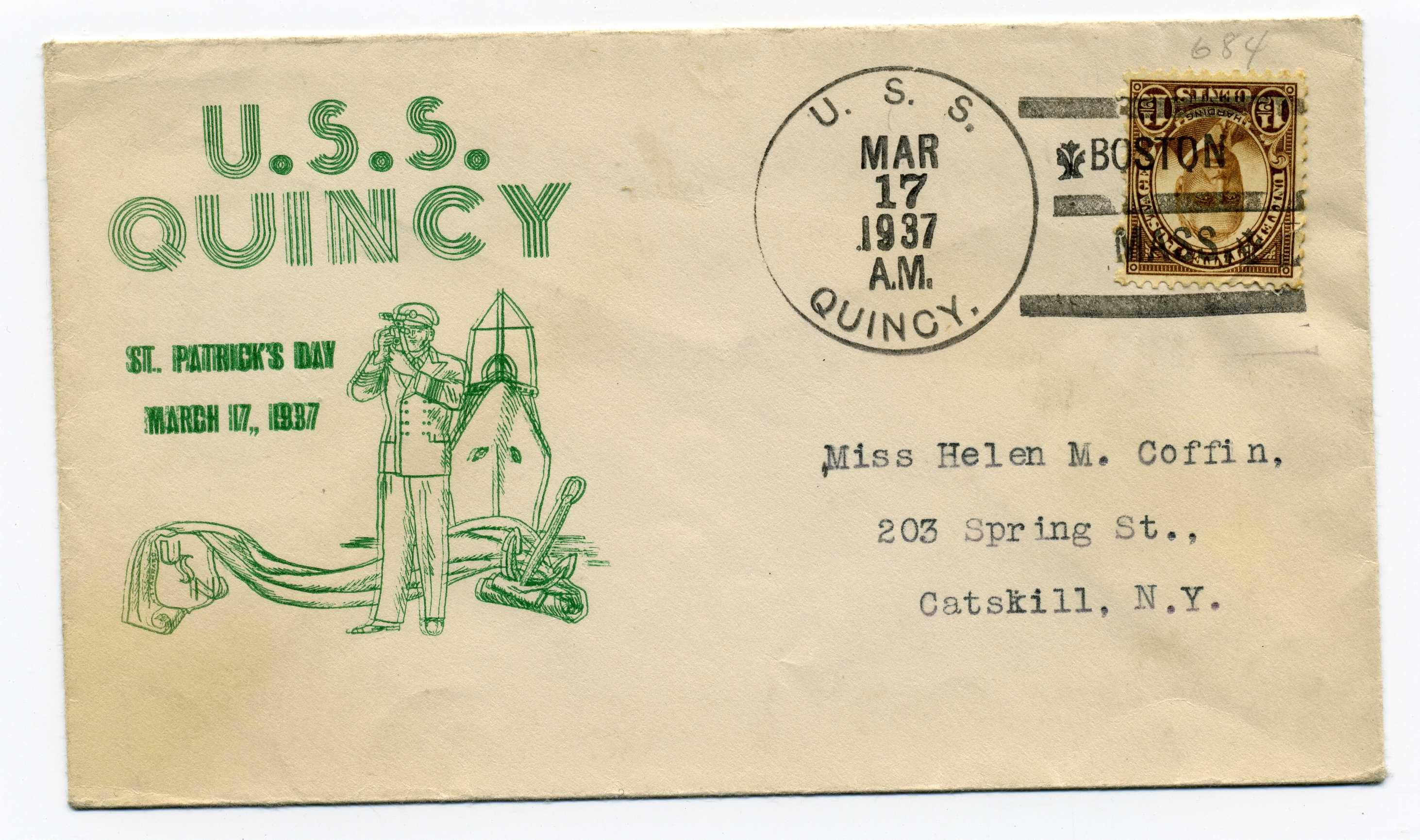 PH051 Image | 1937 St. Patricks Day souvenir cover bearing USA 2 cent adhesive tied by USS Quincy cancel 17/3/37.