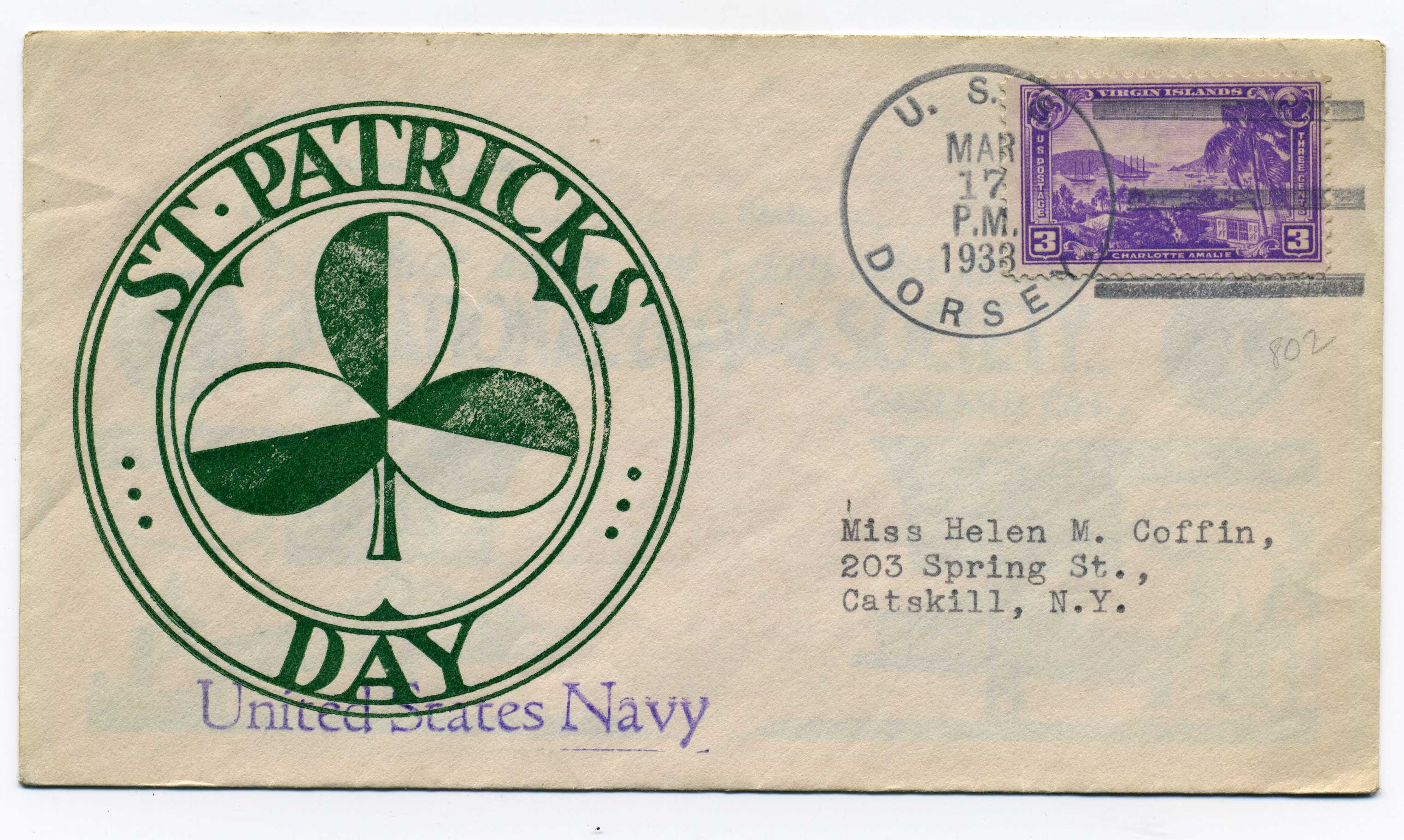 PH052 Image | 1937 St. Patrick's Day souvenir cover bearing USA 2 cent adhesive tied by USS Dorsey cancel 17/3/37.