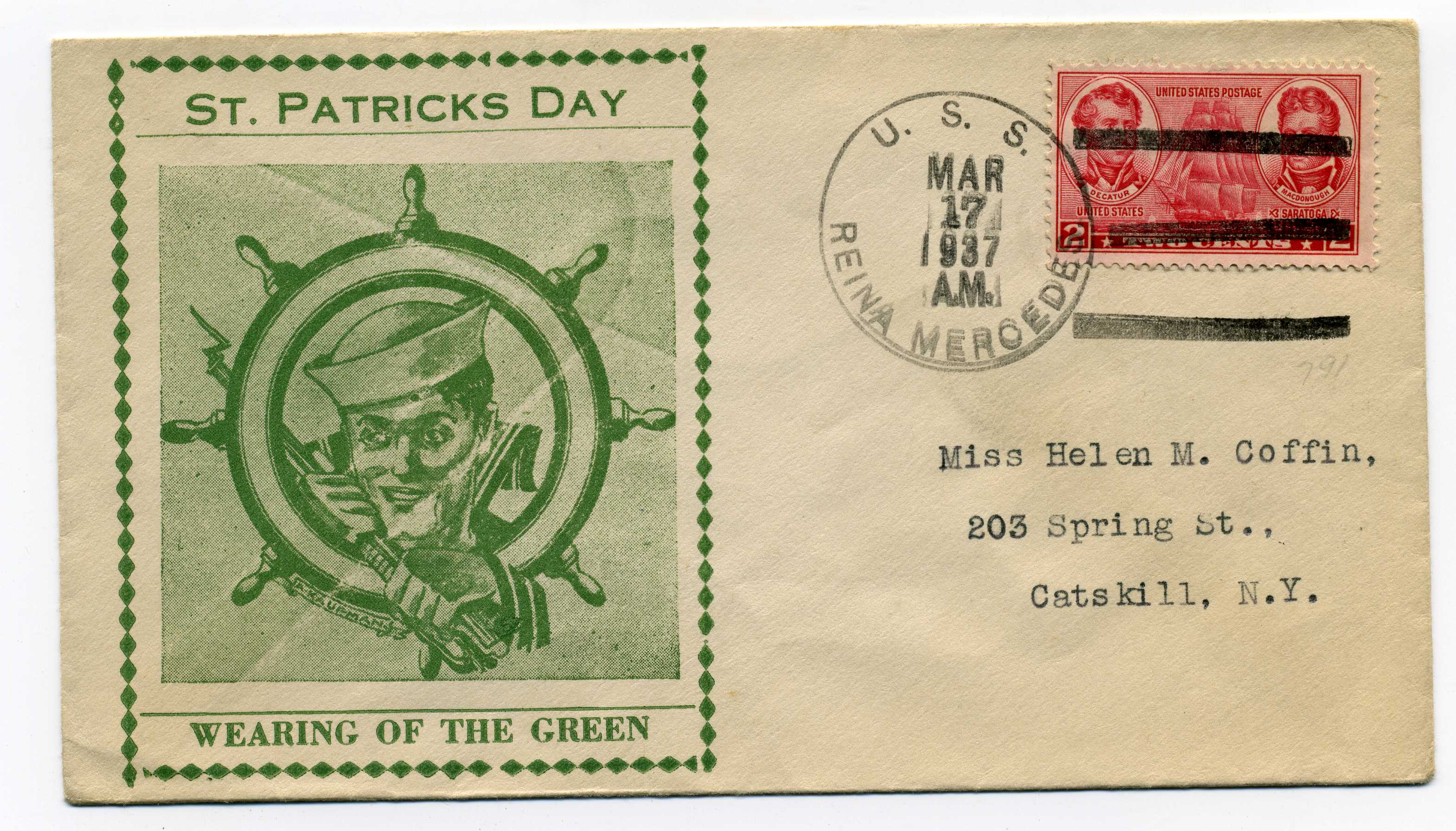 PH053 Image | 1937 St. Patrick's Day souvenir cover bearing USA 2 cent adhesive tied by USS Rena Mercedes cancel.