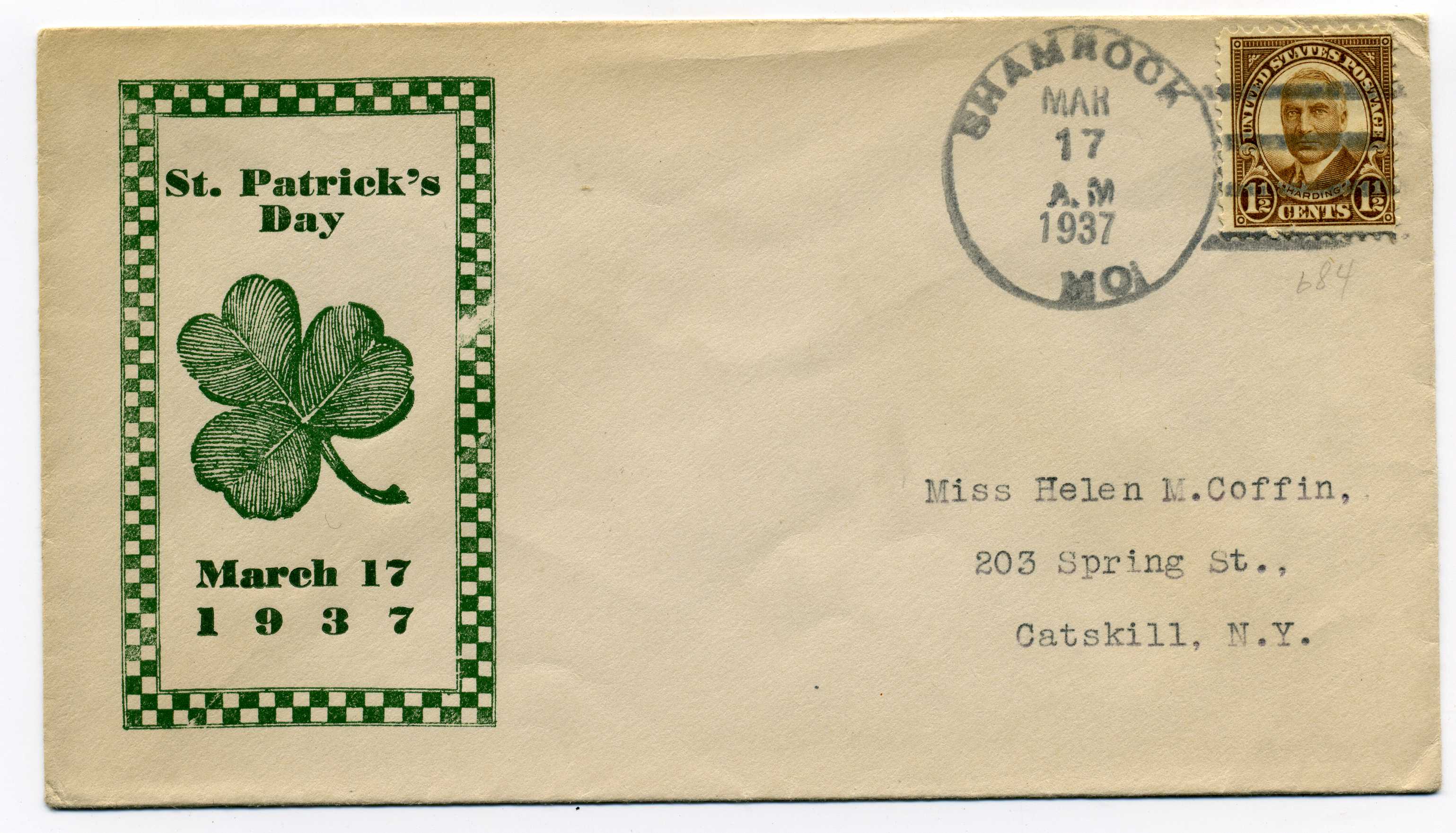 PH056 Image | 1937 St. Patrick's Day souvenir cover bearing USA 2 cent adhesive tied by Shamrock MO machine cancel. 17/3/37