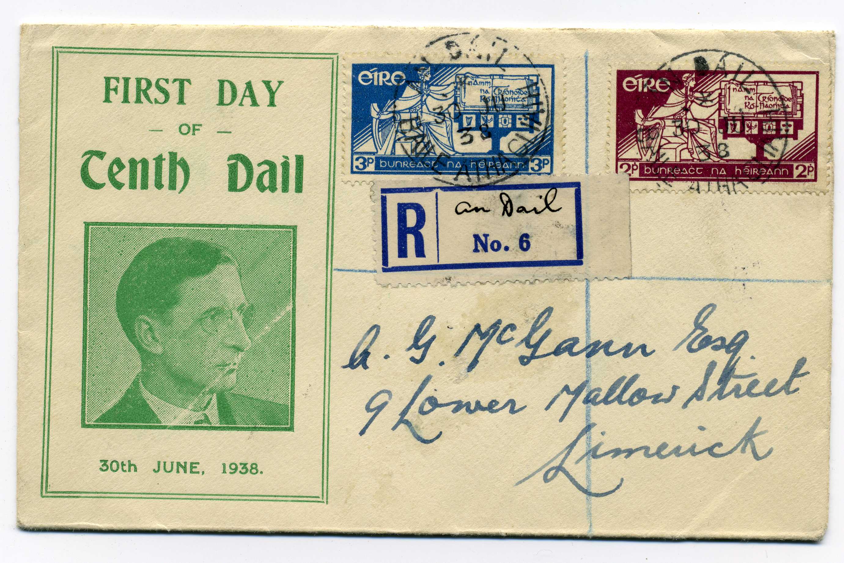 PH059.5 Image | 1938 Registered Souvenir Cover for First Day of 10th Dail used with 1937 Constiuition set tied by An Dail cds and bearing manuscript An Dail reg label